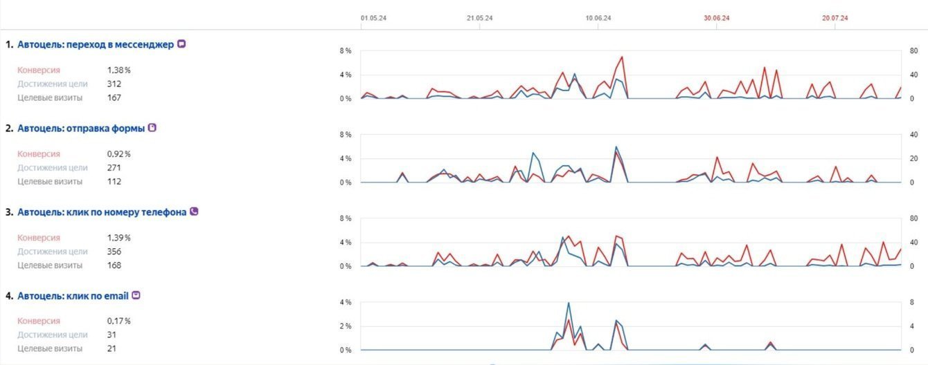 Как видим, есть 2 целевых визита на переходах в мессенджер и 4 – на отправке формы. При рекламном бюджете в 10 000 рублей, стоимости клика в 400 рублей и условии, что клиент работает только с крупными заказами, это уже хороший результат.