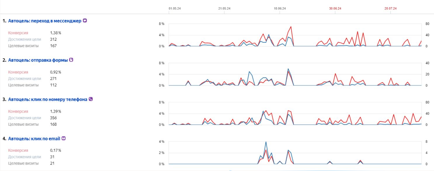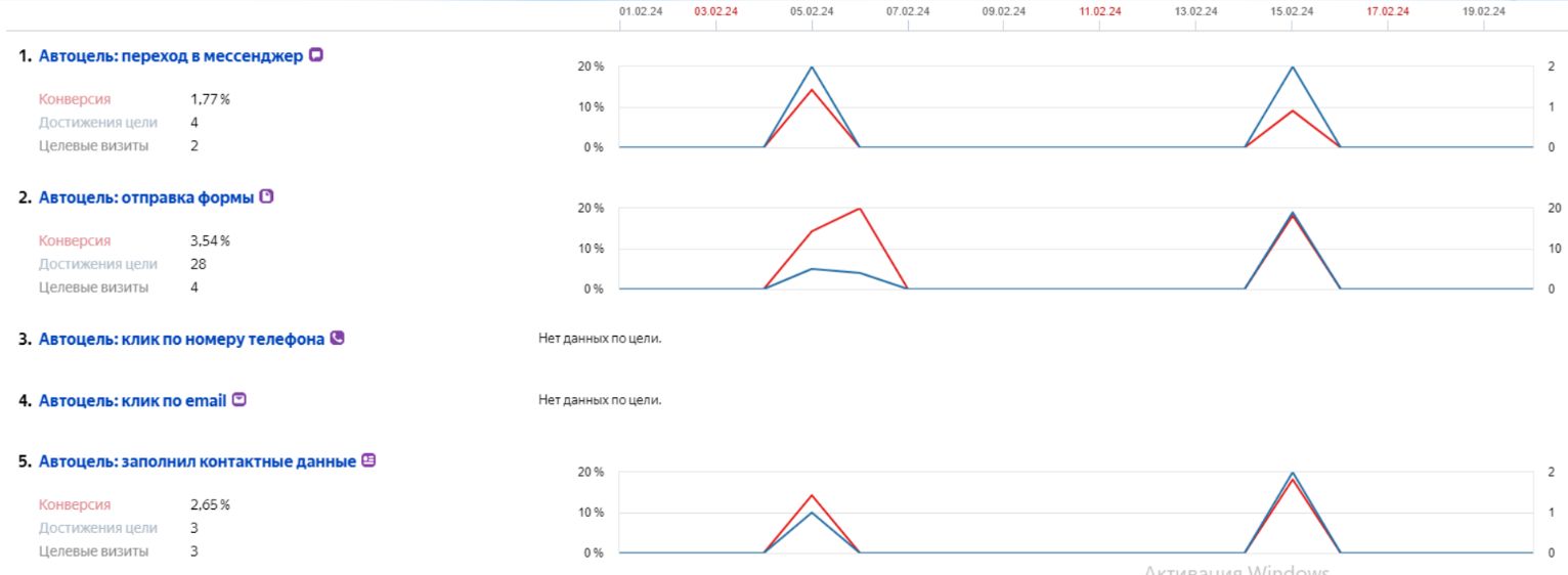 Как видим, есть 2 целевых визита на переходах в мессенджер и 4 – на отправке формы. При рекламном бюджете в 10 000 рублей, стоимости клика в 400 рублей и условии, что клиент работает только с крупными заказами, это уже хороший результат.