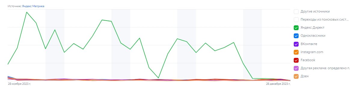 Основным источником платного траффика на сайт остается Яндекс Директ (но если смотреть в разрезе реальных продаж, то разница с соцсетями будет уже не столь разительна, как на графике. Дело в том, что большинство клиентов которые знакомятся с компанией в соцсетях не переходят на сайт, а там же в соцсетях и заказывают).