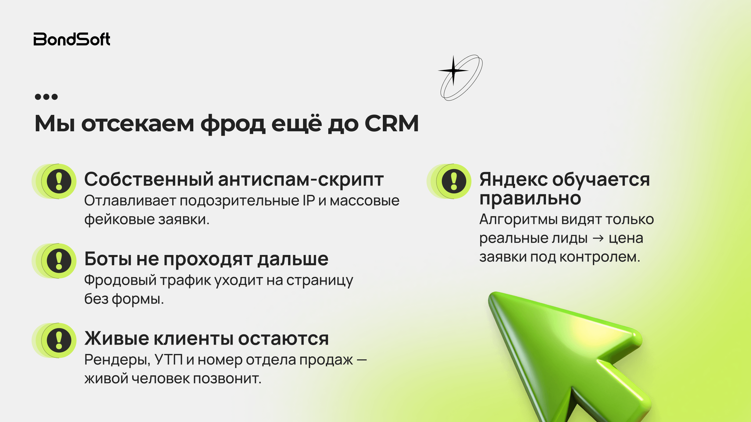 Это позволило отсекать спам ещё на этапе отправки заявки и не допускать обучения алгоритмов Яндекса на фродовых лидах. В первый месяц около 90% заявок оказались целевыми.