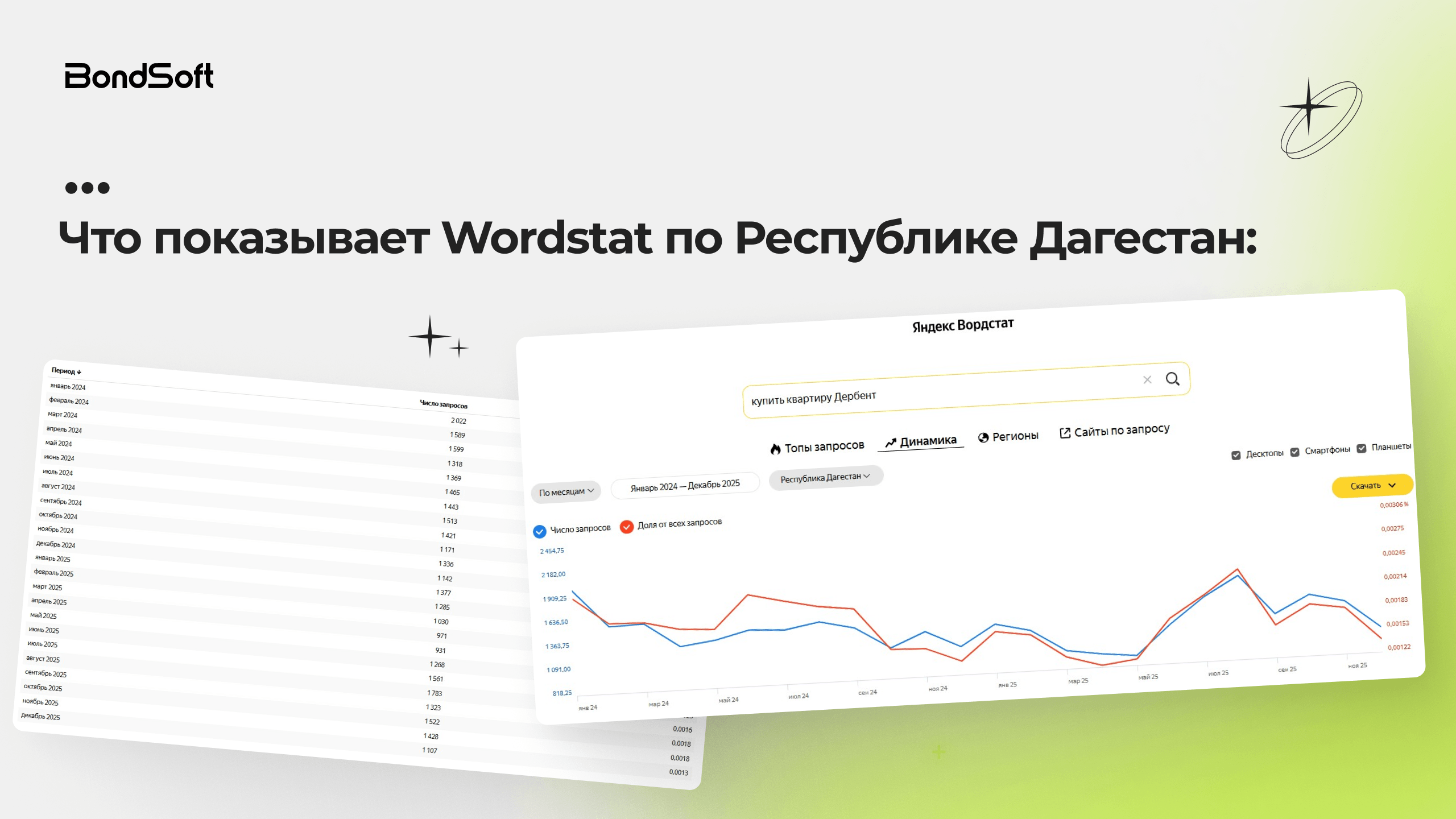 По данным Яндекс Wordstat за 2024–2025 годы интерес к покупке недвижимости в Дагестане сохраняется круглый год. Ежемесячно фиксируется от 900 до 2 000 поисковых запросов, связанных с покупкой жилья.