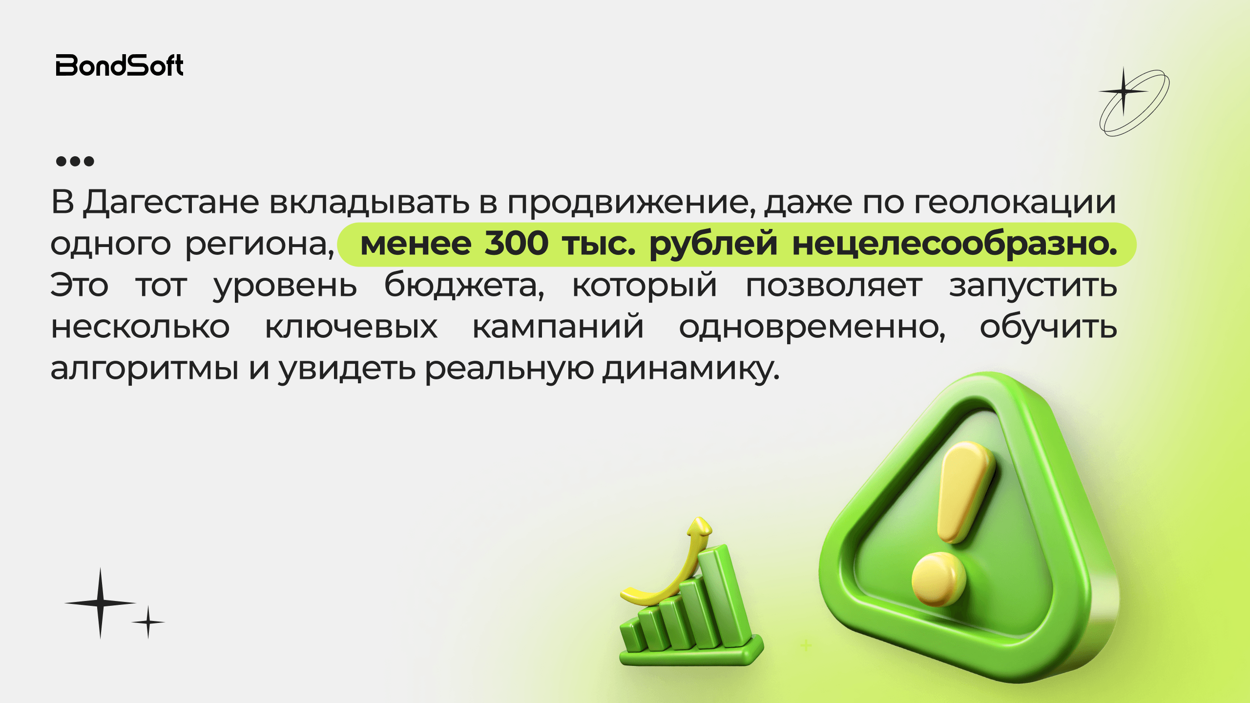 Для рынка Дагестана минимально целесообразный бюджет на региональное продвижение составляет около 300 тыс. рублей в месяц. Этот уровень позволяет запускать несколько кампаний и получать достаточную статистику для оптимизации.