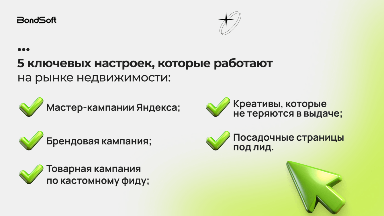 Для эффективной работы мастер-кампаний Яндекса требуется не менее 10 заявок в неделю. При меньшем объёме данных алгоритмы не обучаются, стоимость заявки растёт, а результат становится нестабильным.