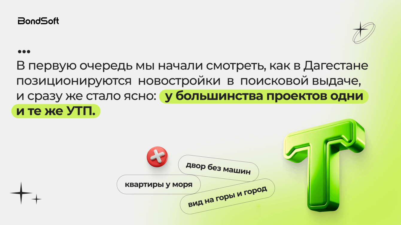 - проанализировать поисковую выдачу Яндекса и конкурентные офферы новостроек в Дагестане;