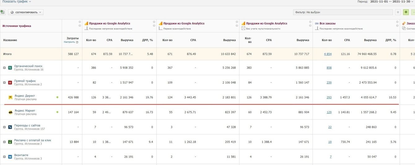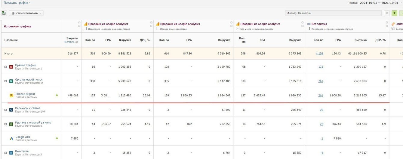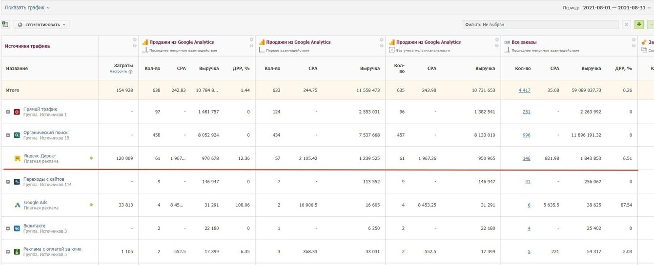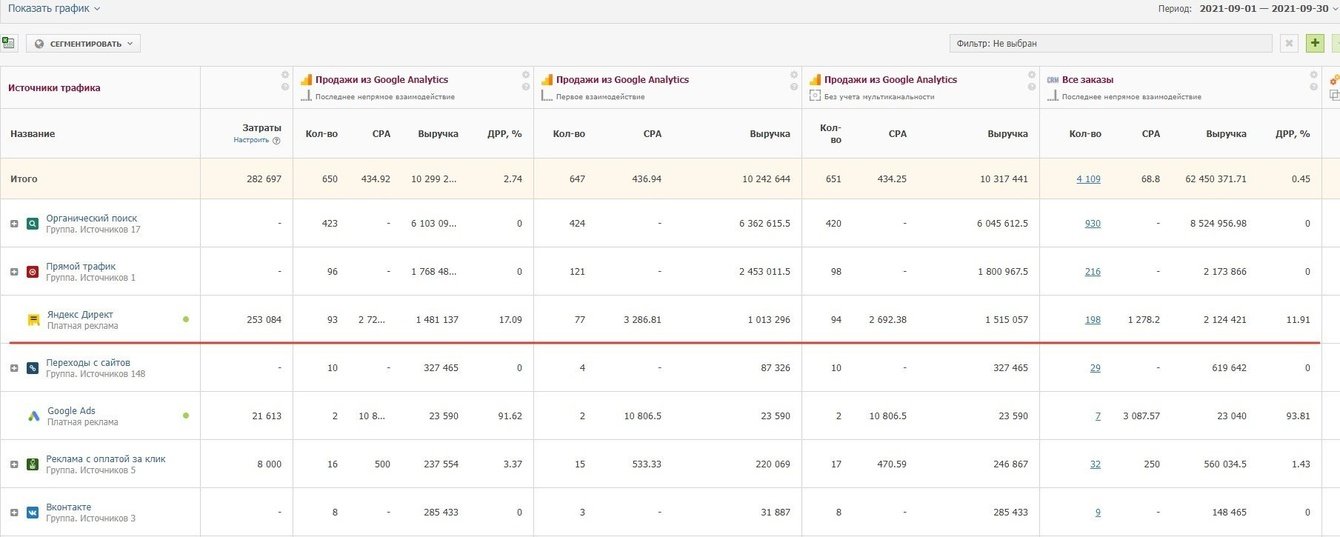 3. С заказчиком был установлен предел значения ДРР 20% по верхней границе, соблюдая который реклама приносит прибыль. Для базовых тестов и фиксации результатов был выделен период в два месяца, далее был момент принятия решения о продлении рекламных кампаний. Ниже скриншоты из сквозной аналитики с результатами за август-сентябрь 2021 года.