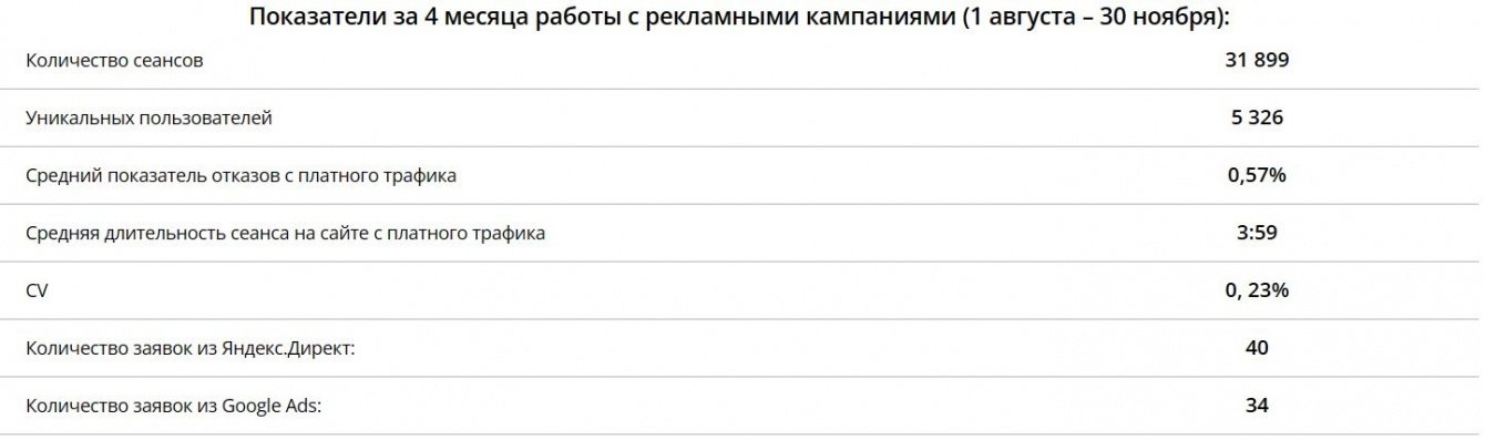 Также были добавлены кампании по условиям ремаркетинга и ретаргетинга (условие — нахождение на сайте больше минуты). Итого было создано около 35 кампаний на каждом из аккаунтов (Яндекс.Директ и Google Ads)