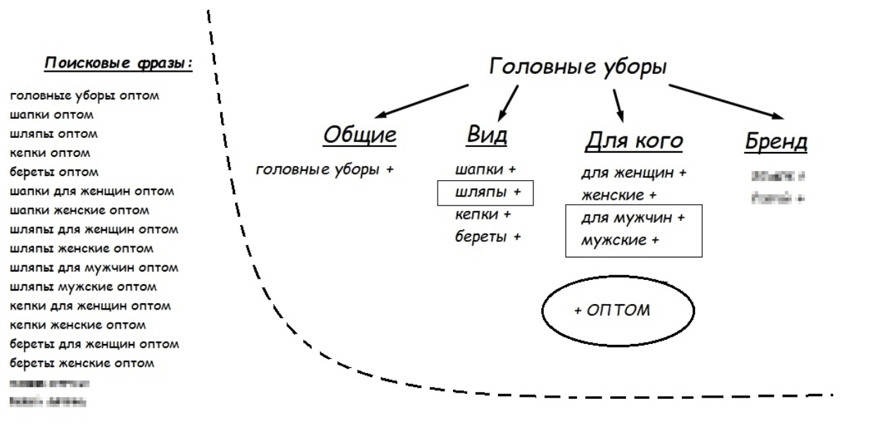 При помощи специальных сервисов мы добавили дополнительные ключевые запросы: «поставщики головных уборов», «оптовая продажа шапок» и т.п. Получившийся в итоге список тщательно проработали, исключив лишнее («детские», «соломенные», «вязаные» и т.п.), и сгруппировали.