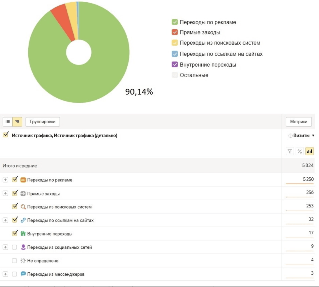 Как видно на графике, переходы по рекламе составили 90,14% от всего объема трафика.