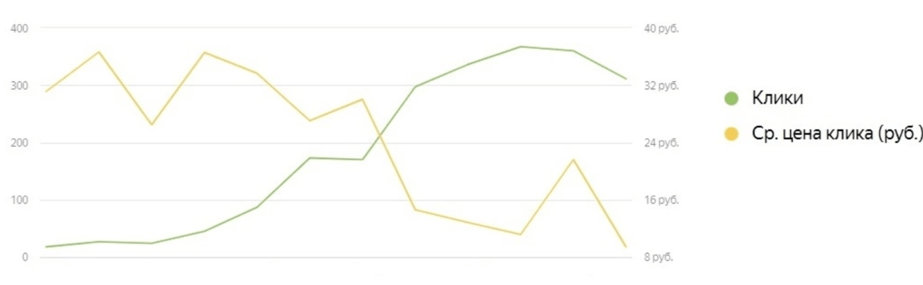 После запуска мы регулярно обновляли список минус-слов и тщательно следили за ставками и бюджетом, что не могло не отразиться на статистике.