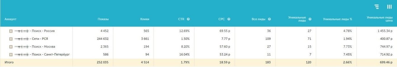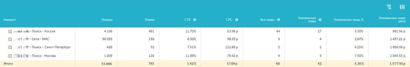 Лучше всего в Яндекс отработала кампания РСЯ. Она принесла 71 уникальный лид по 400,87 руб. В Гугл поисковая кампания по России – 27 уникальных лидов по 981,56 руб.