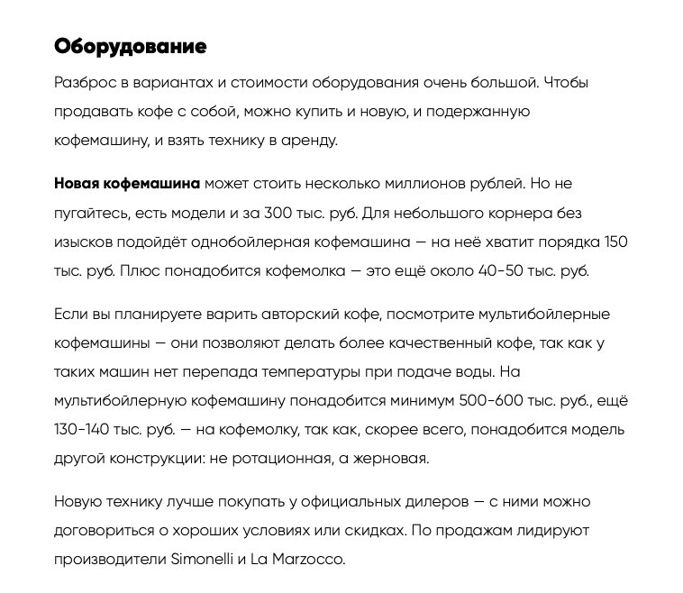 Третий пример — материал про то, как открыть небольшую кофейню. Статья нацелена для тех, кто мечтает о своем бизнесе и хочет понять, с чего начать путь в сфере кофе с собой — от аренды до выбора оборудования и расчета выручки.