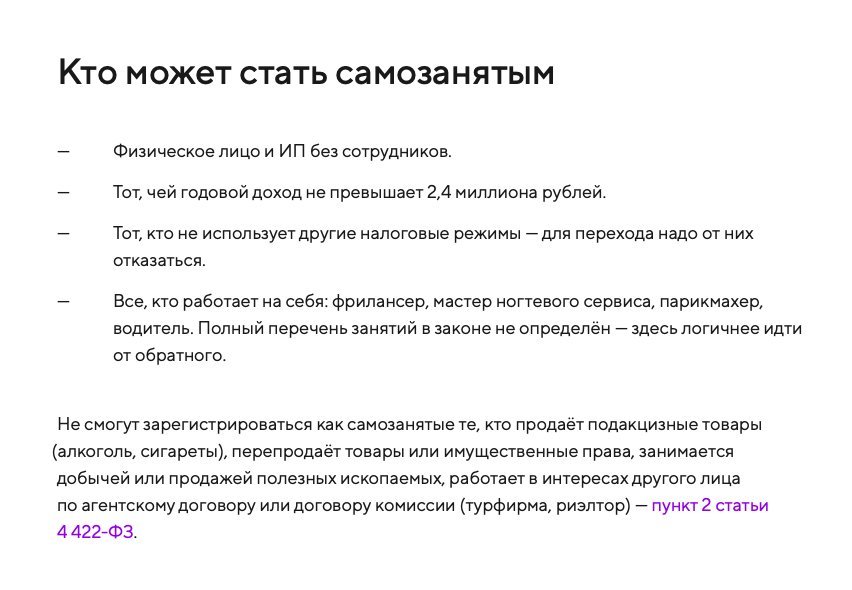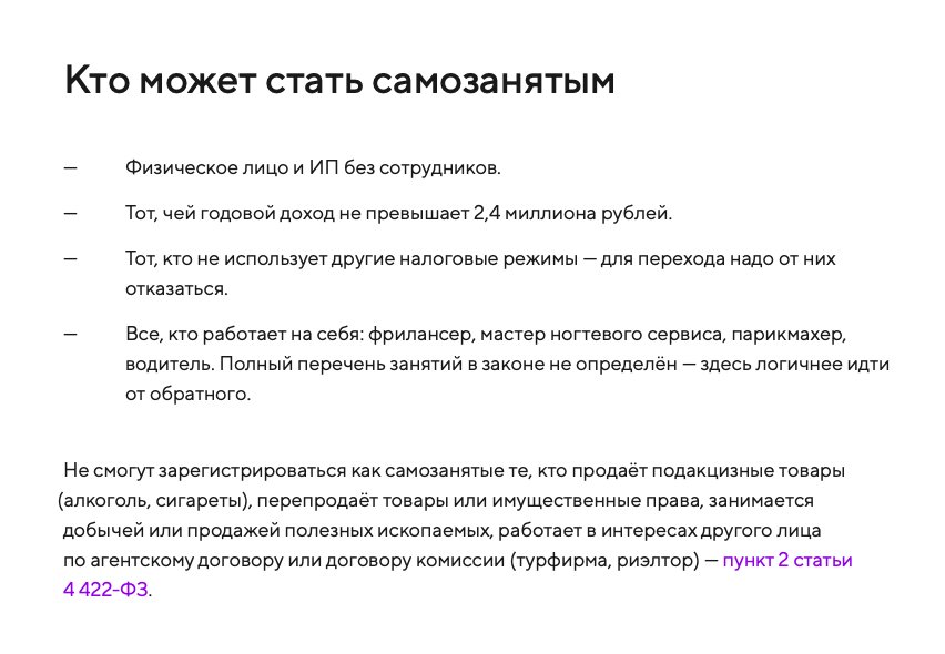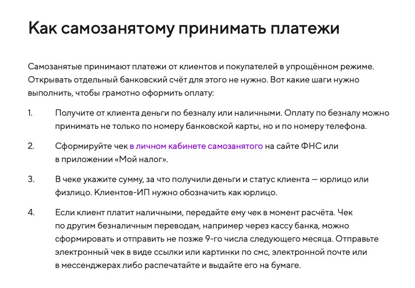 Другой пример — статья про то, как стать самозанятым. Пошаговая инструкция помогает быстро и без ошибок зарегистрироваться в качестве самозанятого, не теряясь в сложных формулировках и бюрократических сложностях.