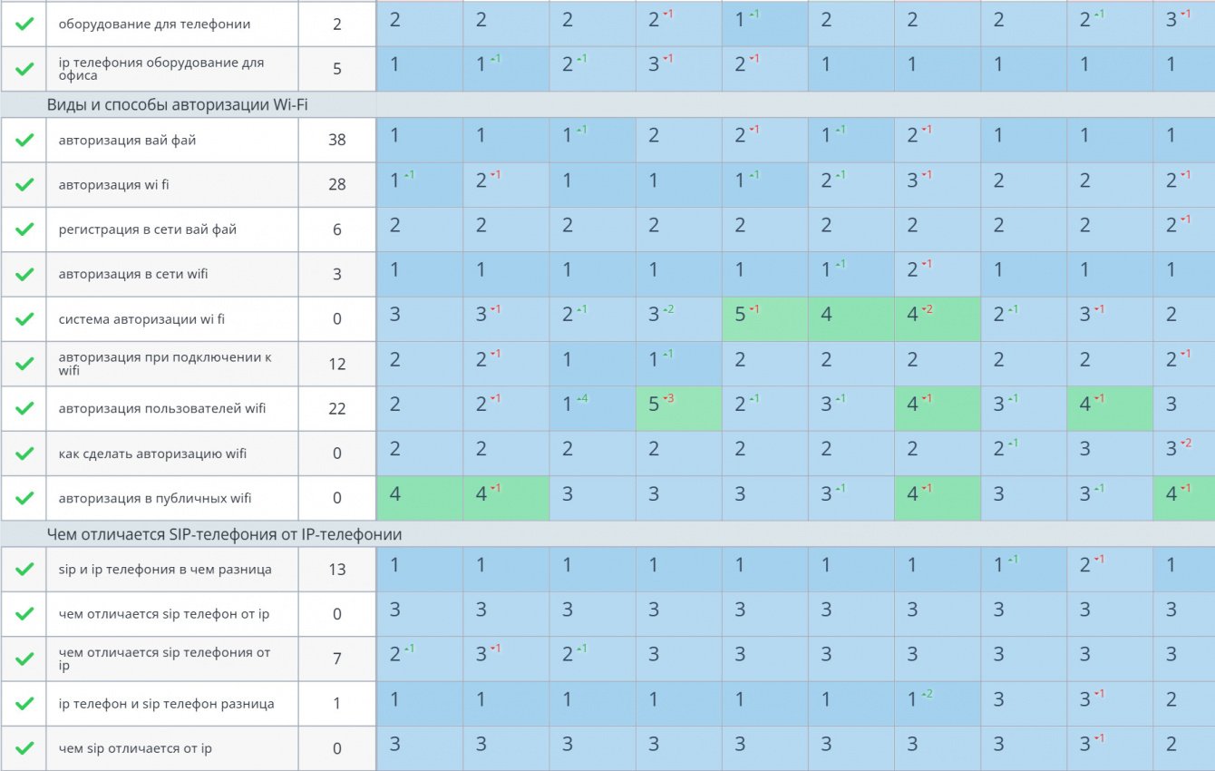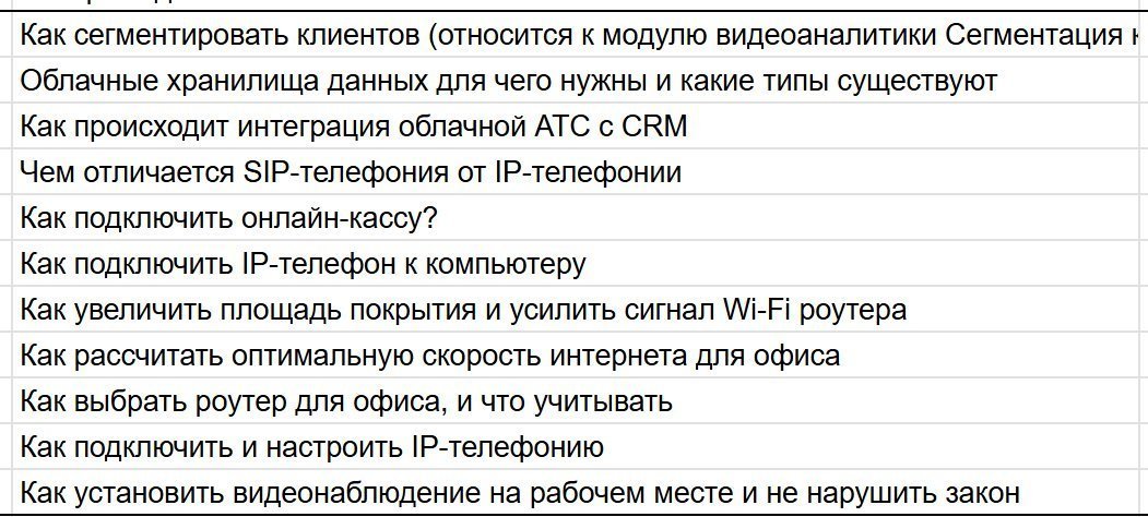 Затем составили темник — список из 100 тем, ориентированных на поисковые запросы и интересы аудитории. Большинство тем были узконаправленными. Найти высокочастотные запросы, которые можно было бы связать с продуктами клиента, оказалось непросто. Но ориентировались не только на SEO-трафик. Вместе с клиентом на каждом этапе обсуждали, о чем важно написать с точки зрения самого телекома, какие возражения клиентов нужно проработать.
