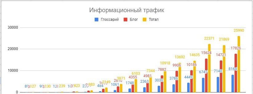 Через 7 месяцев после старта подвели промежуточные итоги. Общий трафик блога и глоссария значительно вырос, даже несмотря на неравномерный график публикаций.