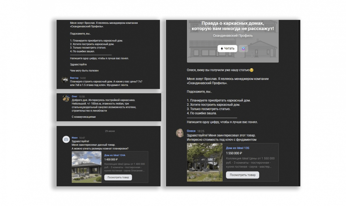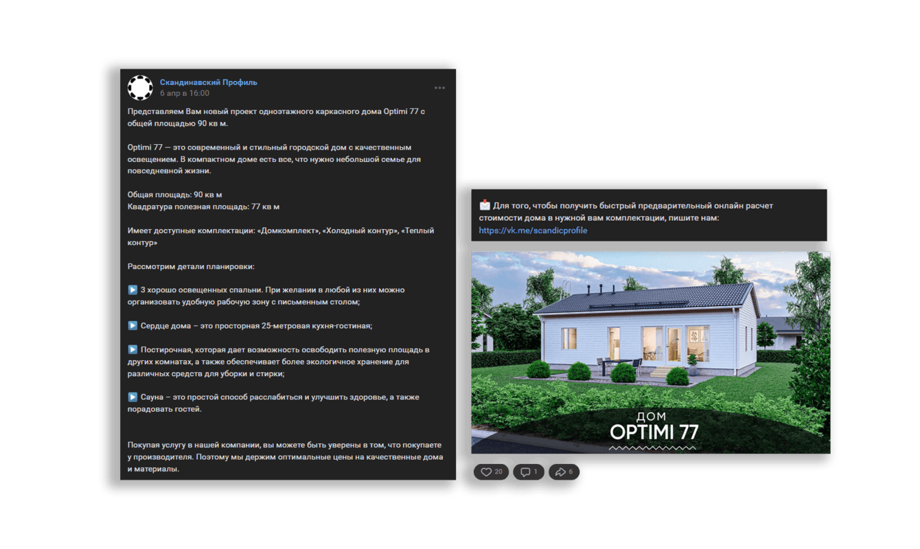 В данном посте мы детально раскрываем не только характеристики дома, но и особенности планировки, а также выгоды для клиента. При этом мы призываем клиента совершить низкострессовый шаг — расчет стоимости дома в нужной комплектации. После этого менеджер по продажам связывается с клиентом и помогает закрыть все вопросы и возражения, а затем переводит клиента на следующий этап воронки.