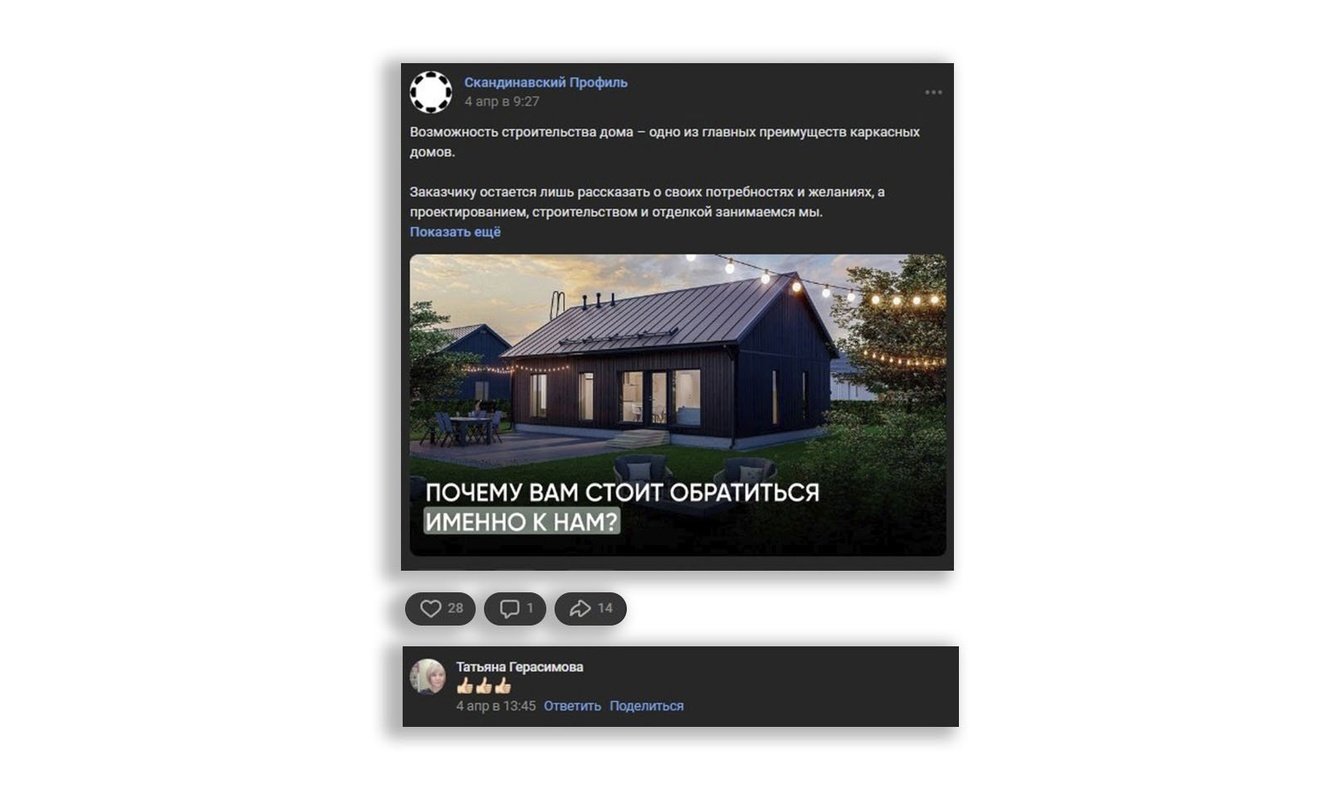 Для повышения охвата постов, привлечения новой аудитории, поддержания интереса подписчиков и получения заявок из ВКонтакте в сфере каркасных домов рекомендуется использовать следующие типы контента: информационный, продающий и «живой». Последний представляет собой реальные фотографии процесса производства домов, а также видеоматериалы.
