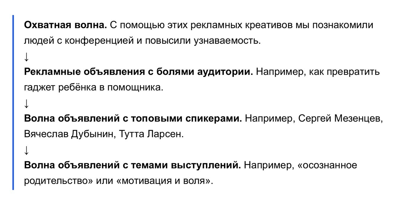 С помощью сегментирования мы охватили всю целевую аудиторию. У нас появились идеи о контенте на первое время. А ещё мы создавали видеоинструкции о том, как купить билет и писали посты о технических моментах. Например, как поучаствовать в конференции бесплатно или в чём разница онлайн и офлайн-участия.