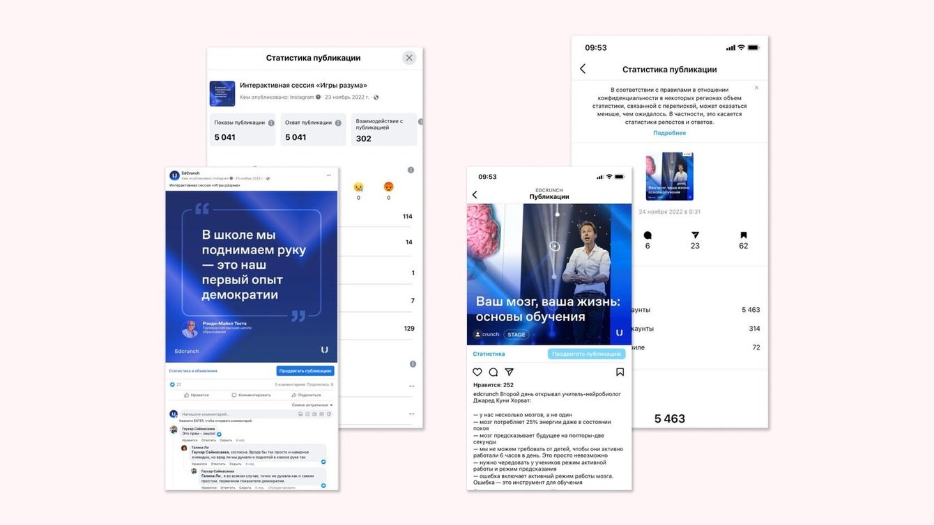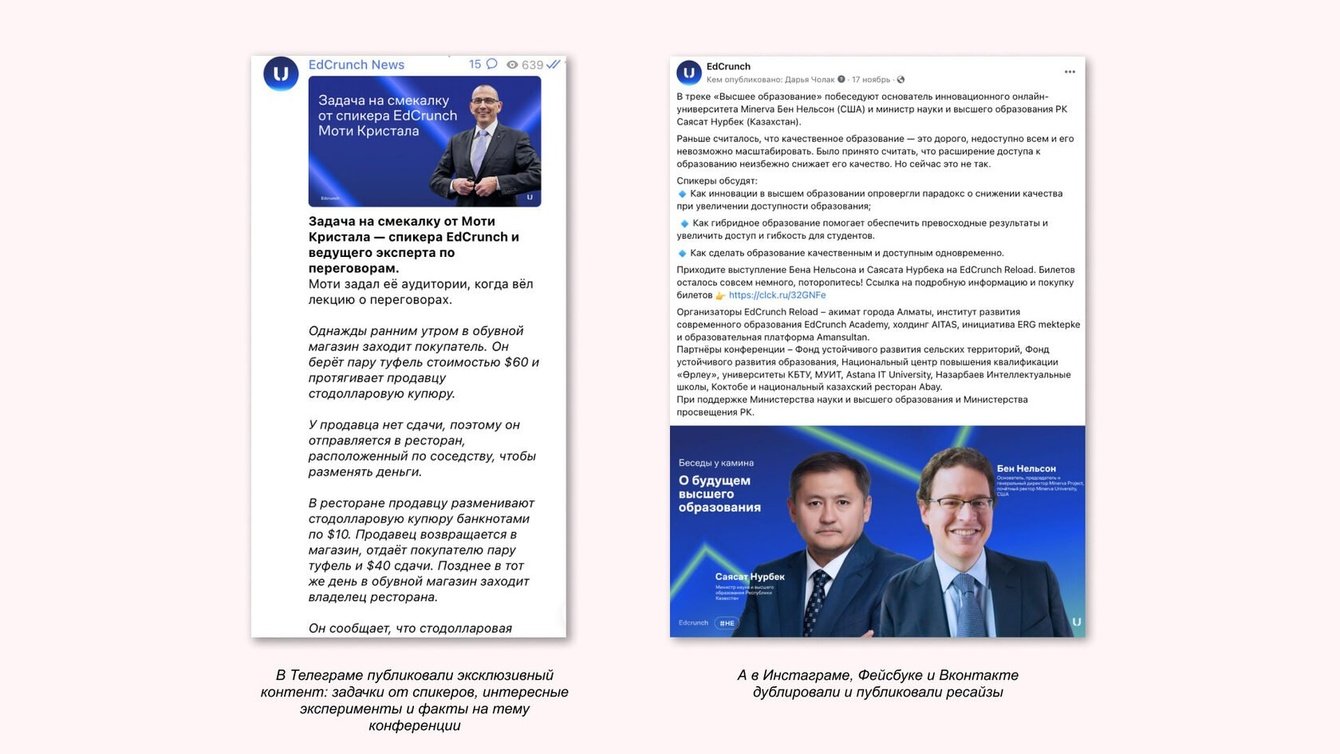 Мы были подрядчиками на самой большой образовательной конференции в Европе и СНГ, где занимались контент-маркетинговым сопровождением. За время нашей работы соцсети выросли в цифрах: русский аккаунт Инстаграма вырос на 826 подписчиков, а казахский — на 1460. С контента и рассылок мы продали 180 билетов.