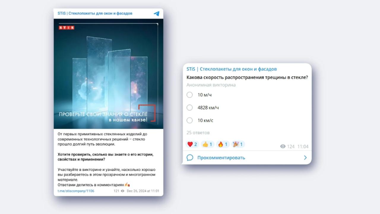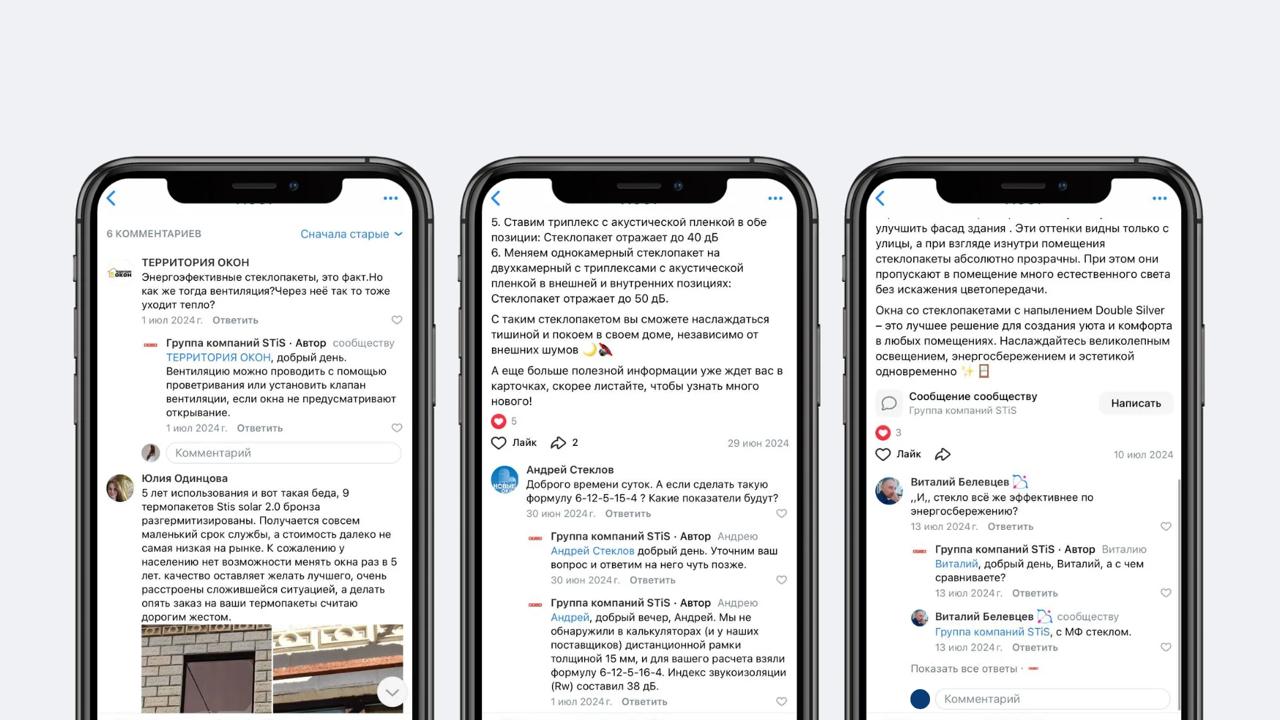 Непринужденный формат опросов дополняли более сложным полезным контентом с погружением в профессиональную сферу. Например, рассказывали что нужно знать для эффектного панорамного остекления, или о декоративном переплете.