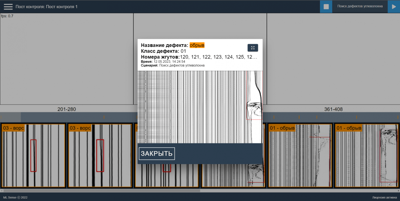 Нейросеть распознает типовые дефекты волокна: ворс, обрыв, узел, изменение толщины, посторонние включения (мусор, насекомые, смола и прочее) и передает обратную связь в интерфейс программы, на сигнальную систему и в MES-систему завода.