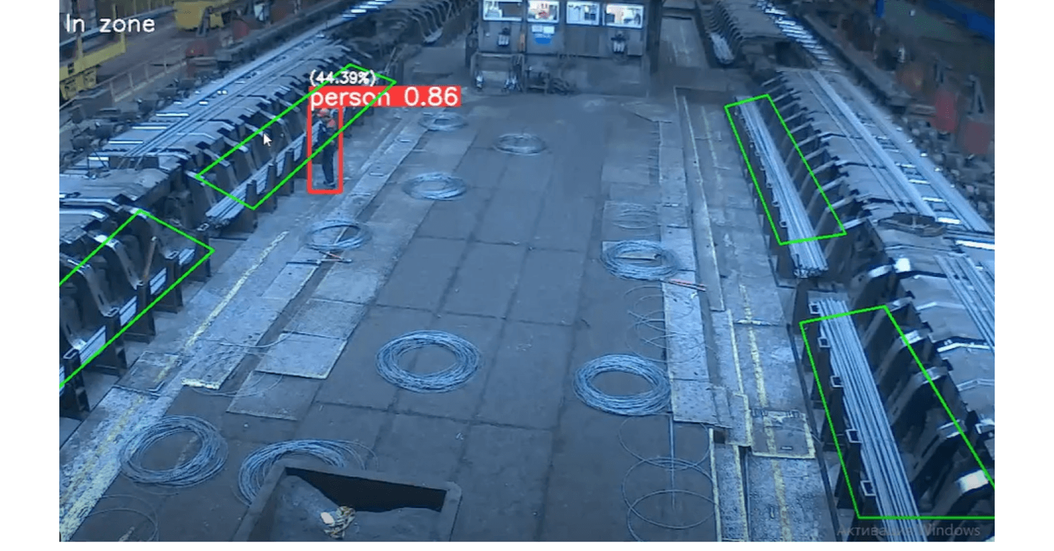Мы обучили модель YOLOv8 на примерах с реального объекта, настроили логику оценки площади тела сотрудника в кадре, которая попадает в опасную зону.
