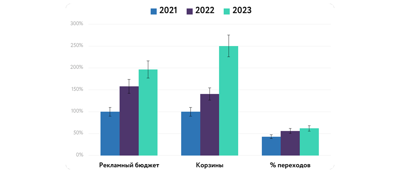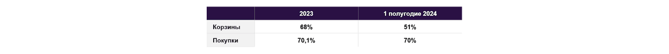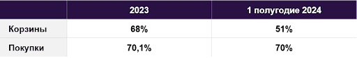 Конечно, всех в кейсах интересуют конверсии (в нашем случае — добавление в корзину) и продажи. За первое полугодие 2024 в стратегиях Дневной бюджет с оптимизацией конверсии средний показатель составил 28%, а максимальные показатели были у статей подборок — до 46,9%.