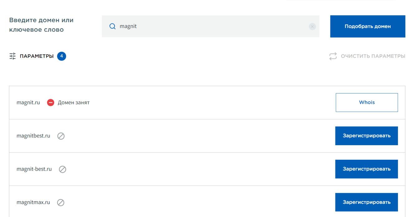 • Если совпадающий с ключевым словом домен занят или такое символьное обозначение недоступно для регистрации, сервис сообщит об этом и предложит другие доступные для регистрации варианты доменных имен.