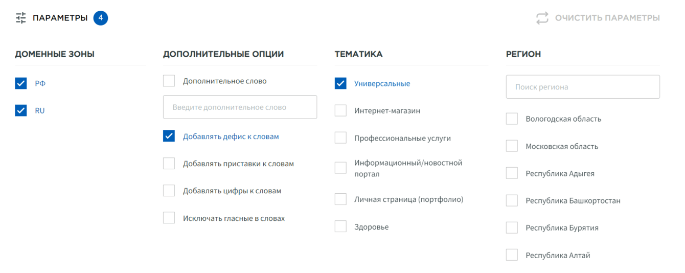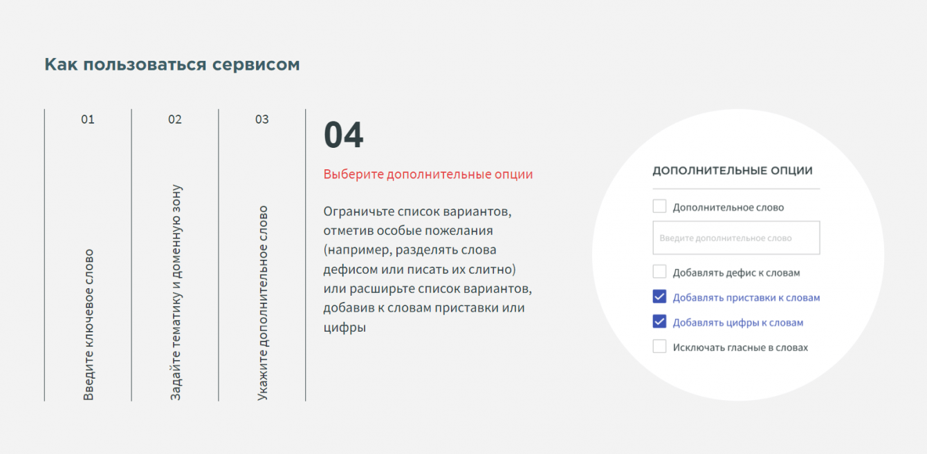 Помимо подбора доменного имени по ключевому слову, сервис предоставляет возможность указать географический регион, в котором планируется развивать сайт, а также выбрать дополнительные опции: добавление к основным словам дополнительного слова, дефиса или приставки, использование цифр, исключение гласных и другие возможности, исходя из которых сервис подберёт доменное имя.