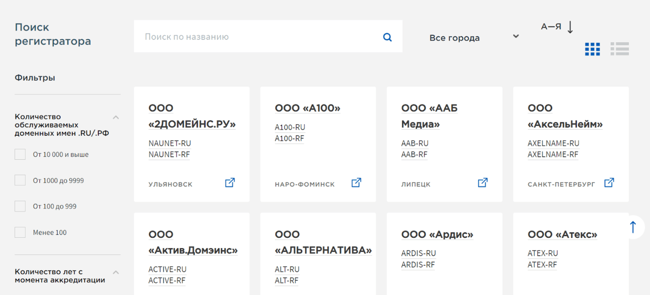 Для поиска подходящего регистратора можно применить специальные фильтры, например, количество обслуживаемых доменных имен, количество лет с момента аккредитации регистратора, наличие дополнительных услуг для сайта и почты, наличие протокола безопасности и другие.