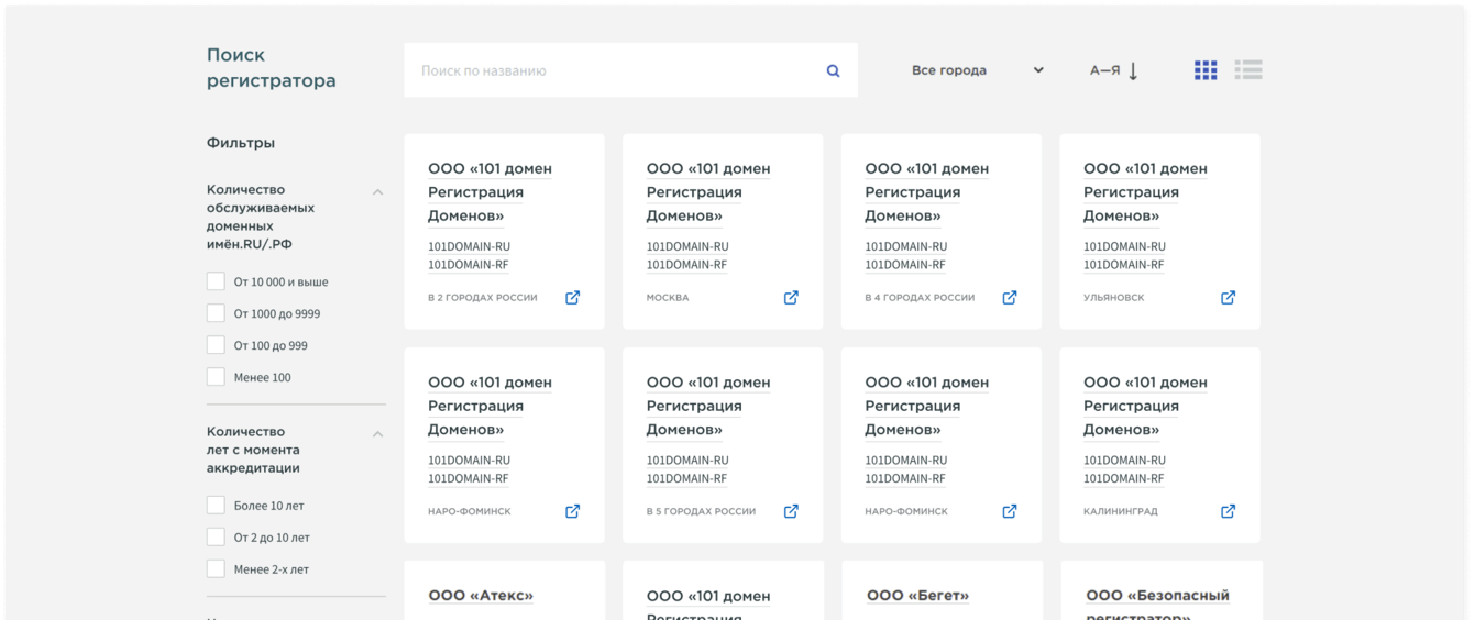• Создать удобный фильтр на странице подбора регистратора — важный блок для выбора аккредитованного регистратора.