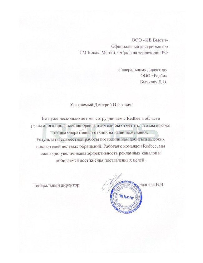 Вот уже несколько лет мы сотрудничаем с Редби в области рекламного продвижения бренда и хотели бы отметить, что мы высоко ценим оперативный отклик на наши пожелания. Результаты совместной работы позволили нам добиться высоких показателей целевых обращения. Работая с командой Редби, мы ежегодно увеличиваем эффективность рекламных каналов и добиваемся достижения поставленных целей.
