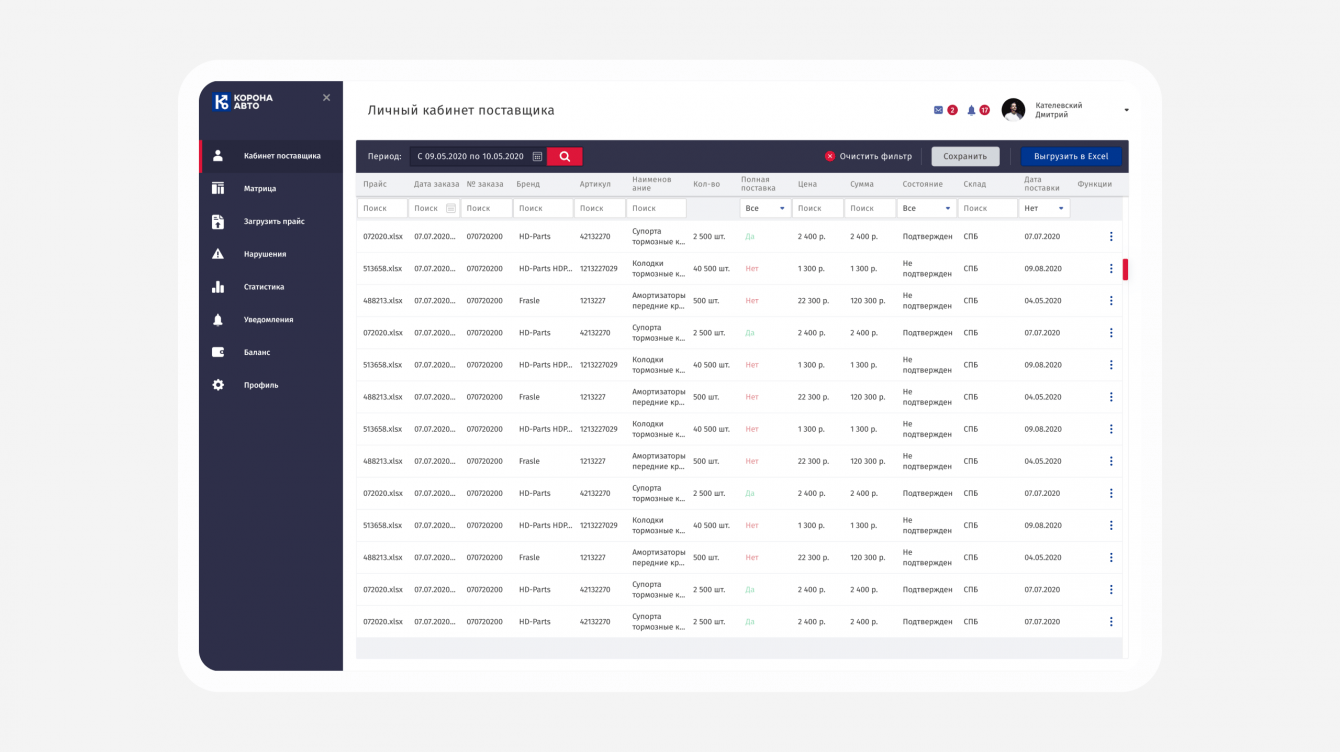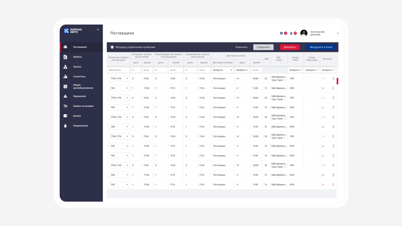 Реализовали матрицу прайсов в личном кабинете. Матрица необходима для того, чтобы контролировать процесс обработки заказа поставщиком и отслеживать, на каком этапе оформления он находится. Заполнением матрицы занимается поставщик, однако менеджер тоже может редактировать данные таблицы.