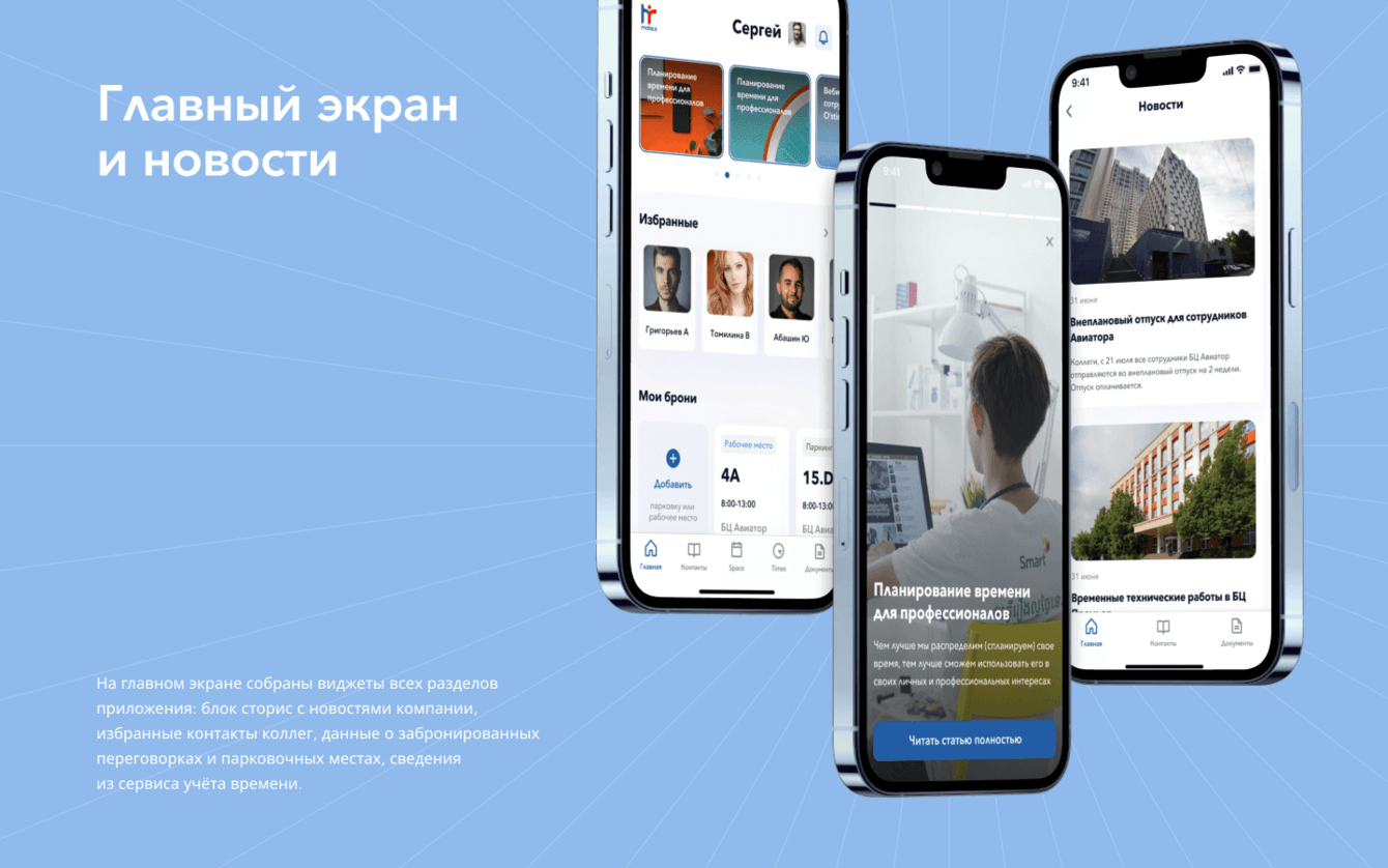 На главном экране собраны виджеты всех разделов приложения. О новостях компании рассказывает блок сторис. Ниже — избранные контакты коллег и данные о забронированных переговорках и парковочных местах. Также на главный экран выведены сведения из сервиса учёта времени — график работы и отчёт об отработанных часах.