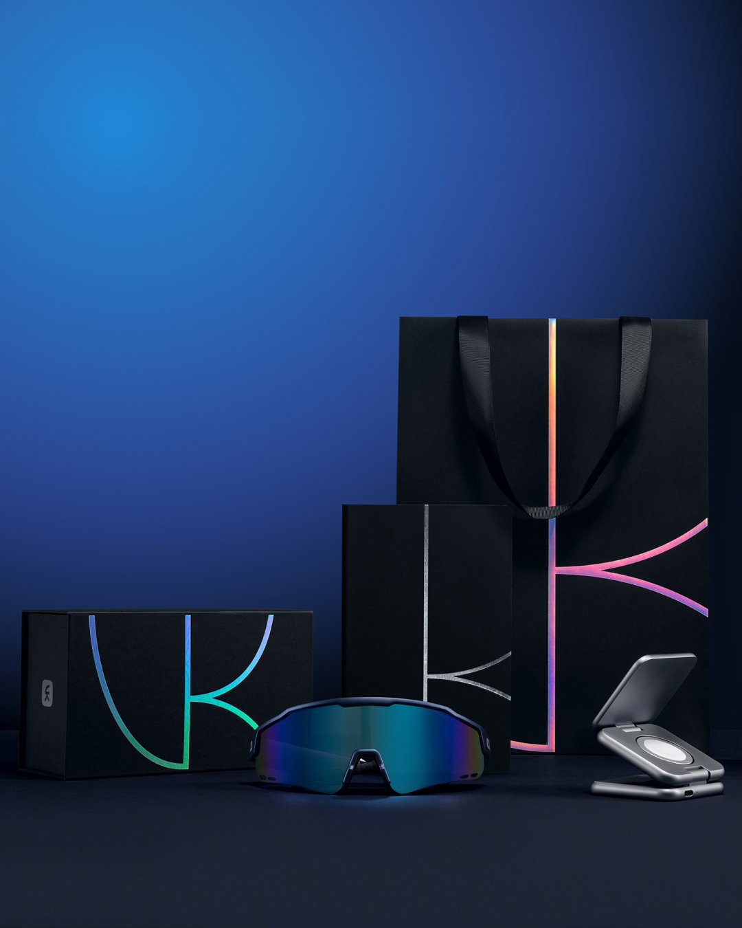 Воплощением новаторского имиджа бренда стал современный и технологичный визуал, который реализован в минималистичном и практичном подарке. Центром поздравления стали умные очки с наушниками и фирменная беспроводная зарядка для гаджетов. Эти вещи смогли отлично отразить прогрессивность VK через практичность, мультифункциональность и строгую красоту.