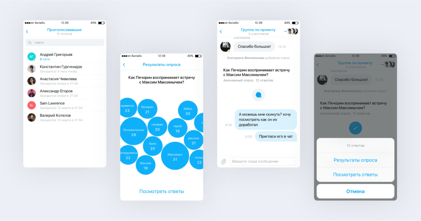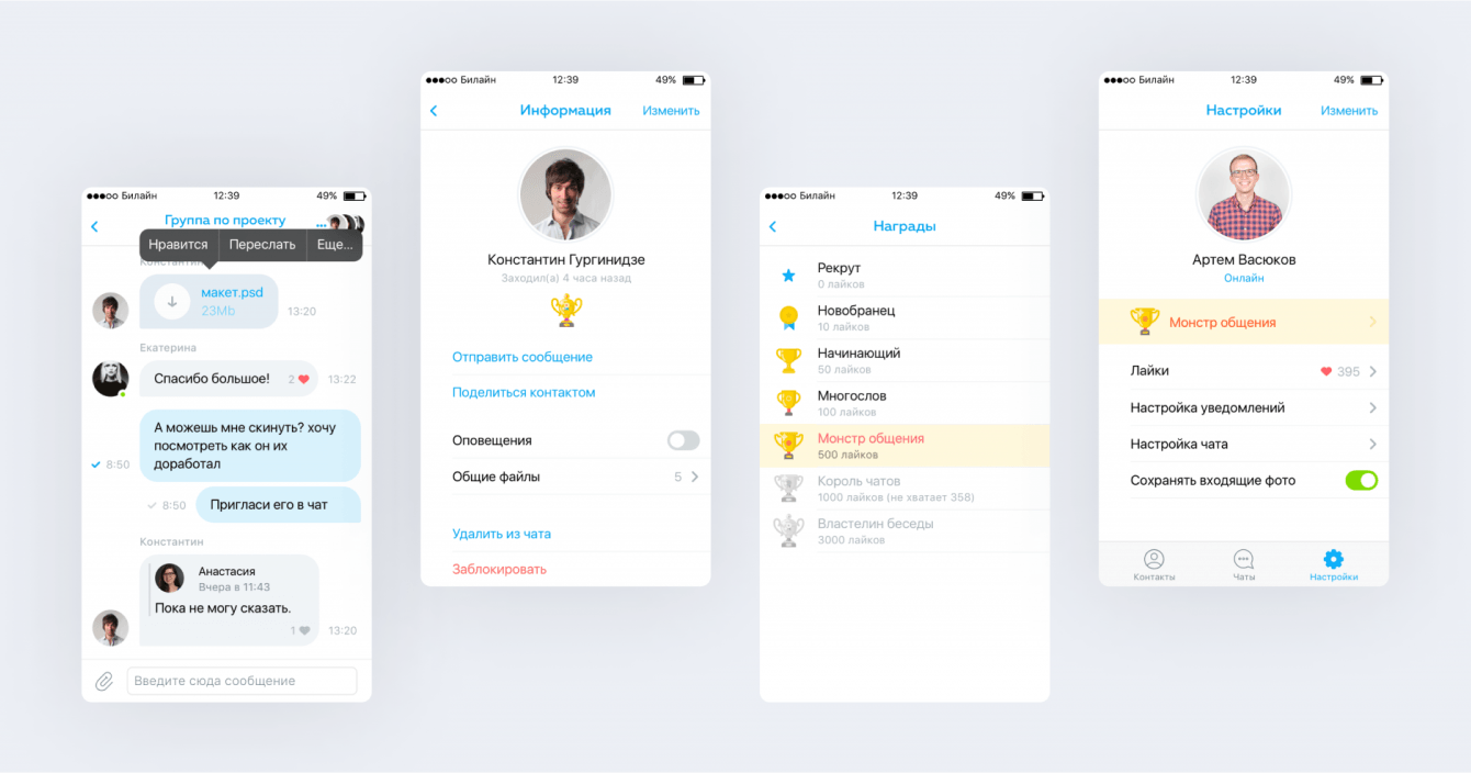 Мессенджер мотивирует предлагать идеи. Собеседники могут лайкнуть сообщения и добавить баллов в общий профиль сотрудника. Баллы можно обменять на плюшечки и мерч.
