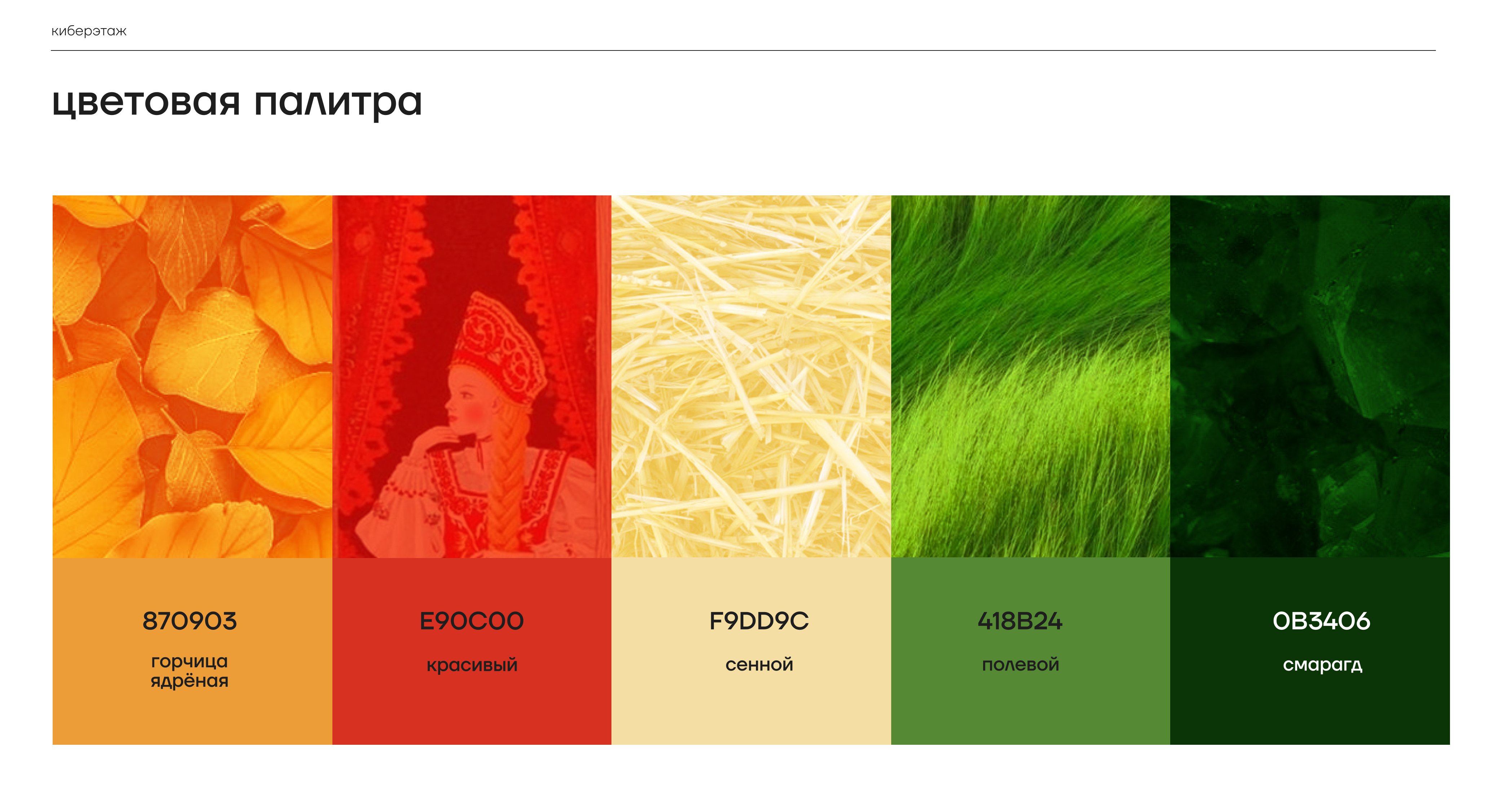 «Ядрёная горчица», «красивый» и «сенной»: тёплая и энергичная группа цветов, олицетворяющая творческую свободу, источник энергии и естественную среду для генерации идей. «Полевой» и «смарагдовый»: насыщенные природные тона, символизирующие устойчивость, рост и надёжность — фундаментальные ценности технологического сообщества.