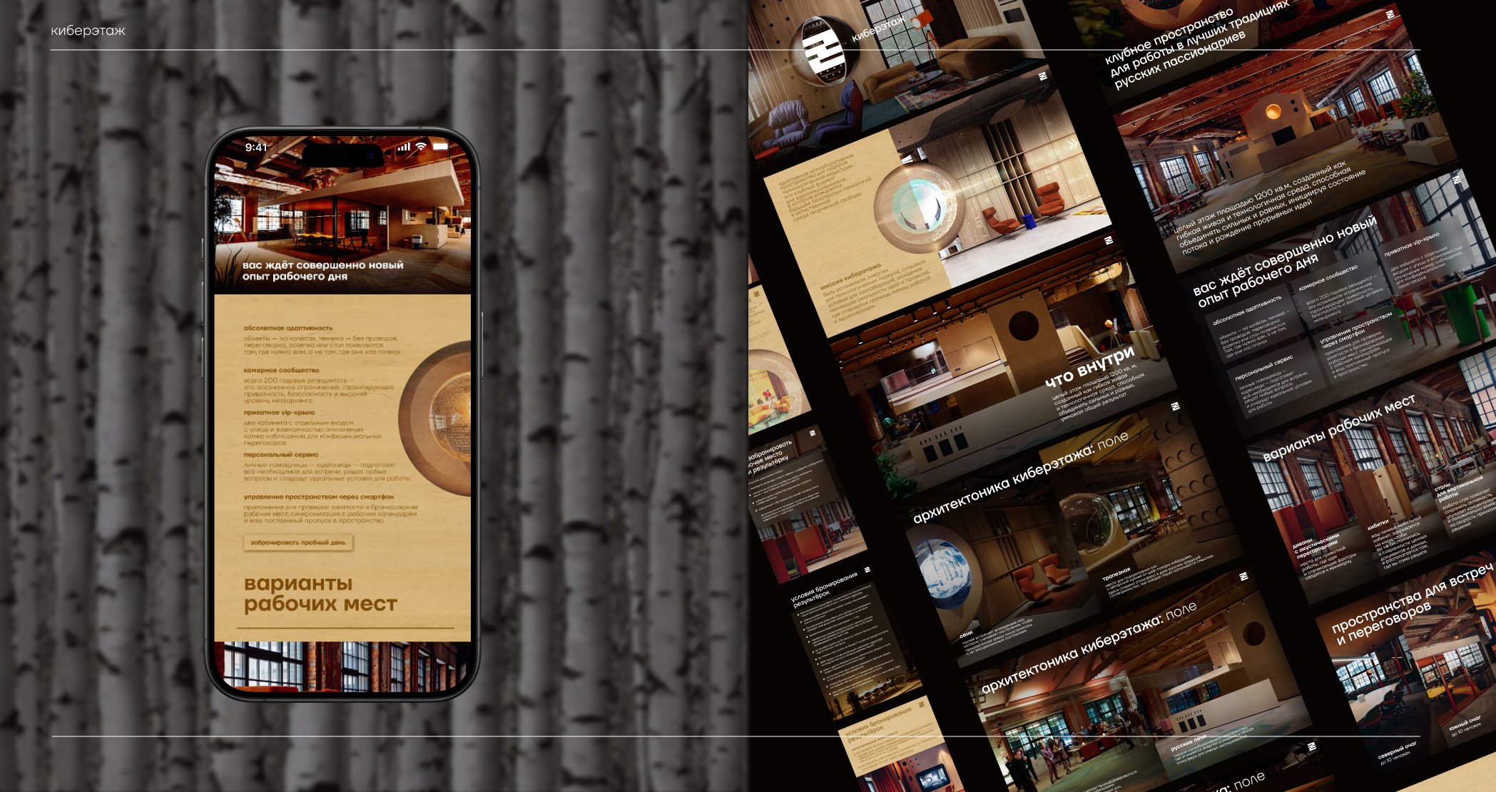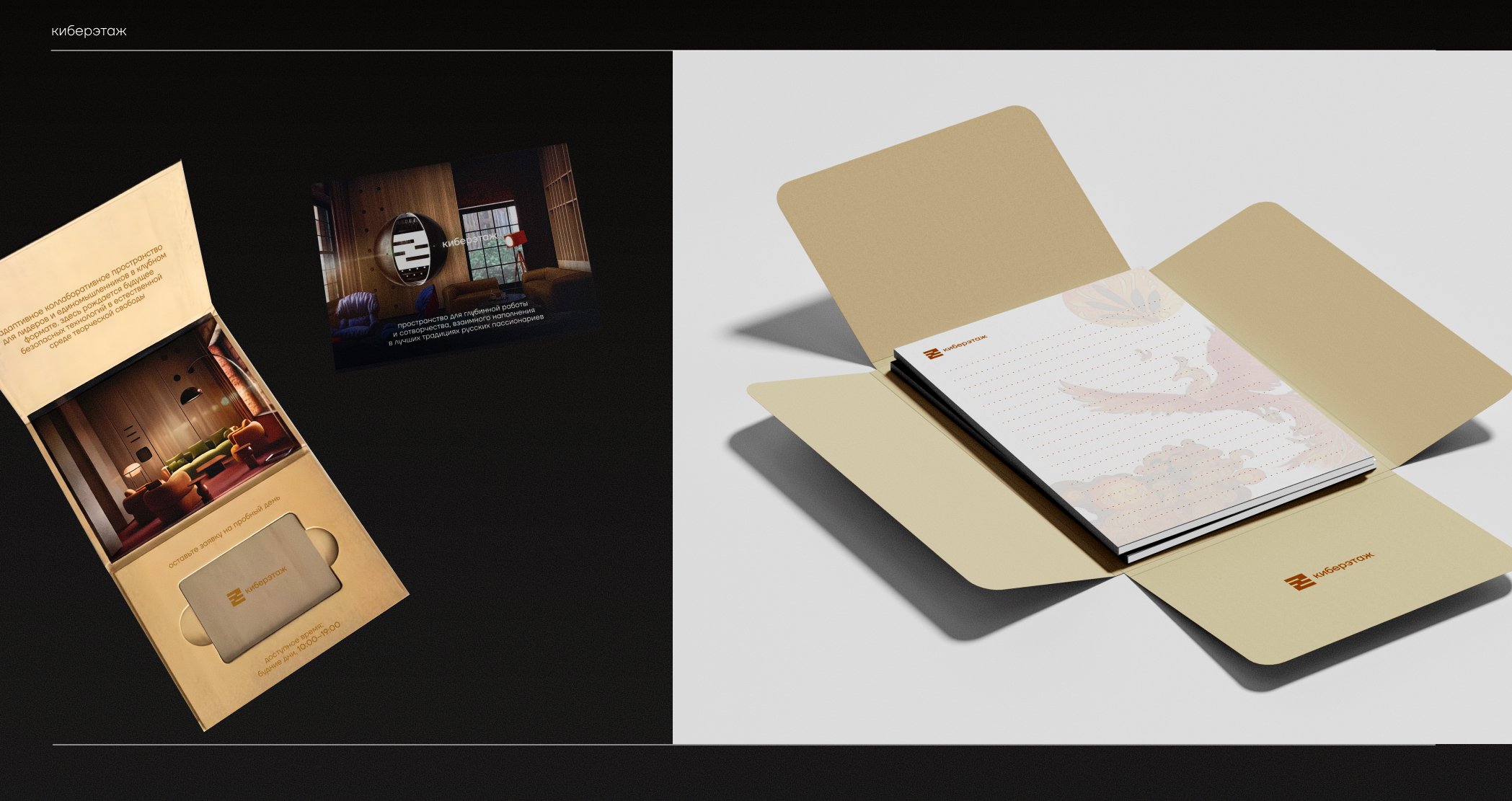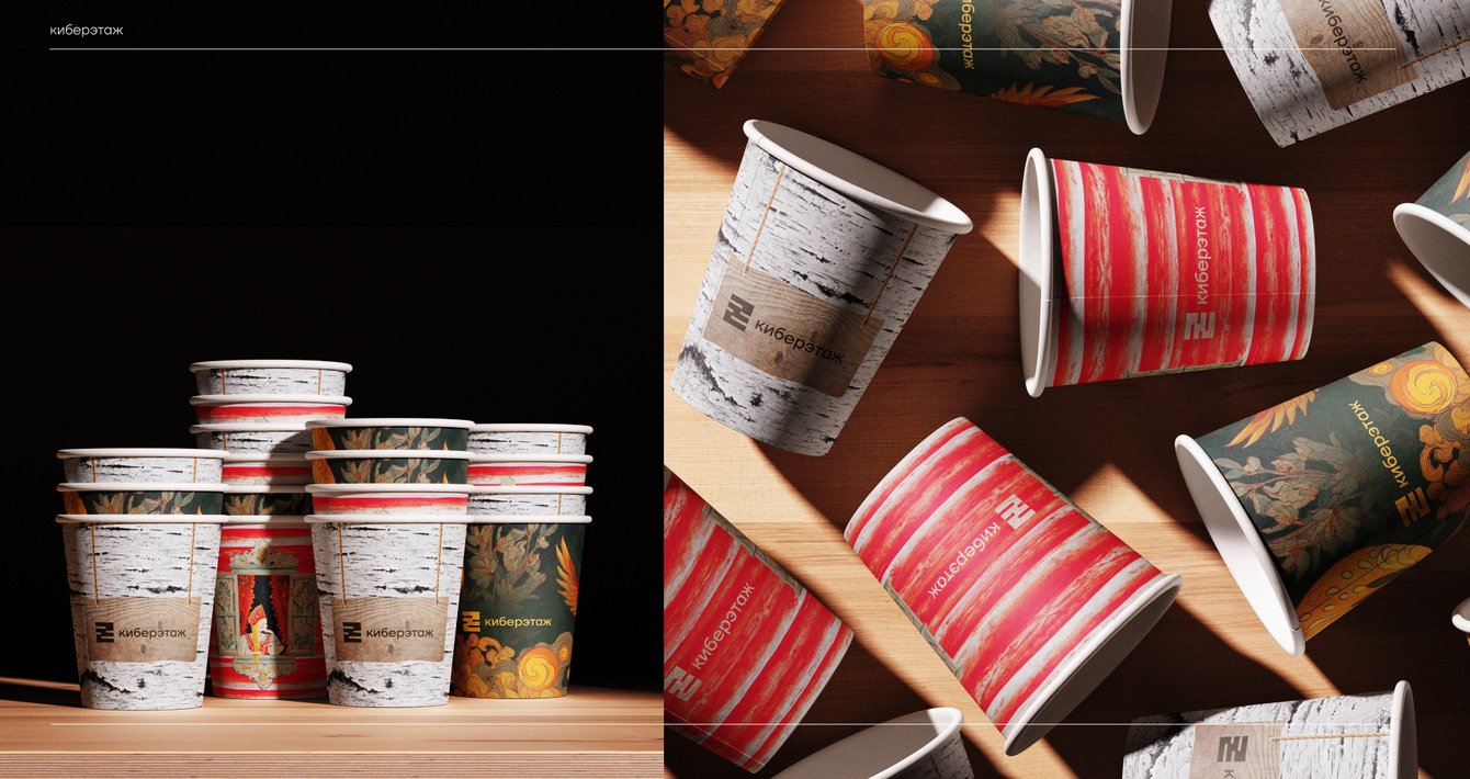 Визуальная айдентика Киберэтажа находит продолжение во всех полиграфических материалах, которые становятся частью пространства. В них также были заложены отсылки к русскому культурному коду — мотивы славянской мифологии и природные текстуры. Жар-птица как символ прорывной идеи, красна девица как архетип света и чистоты, береста как носитель ценной информации — эти образы создают визуальный язык, в котором древние корни встречаются с устремлённостью в будущее.