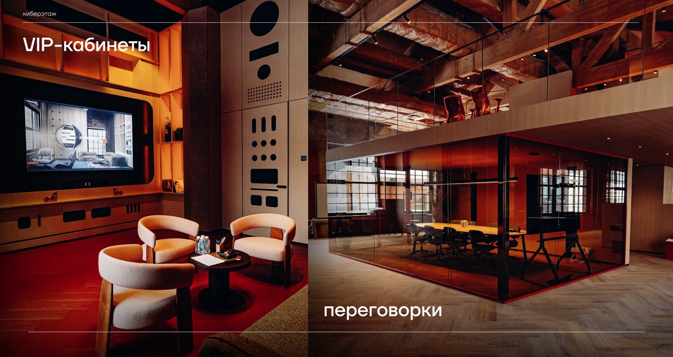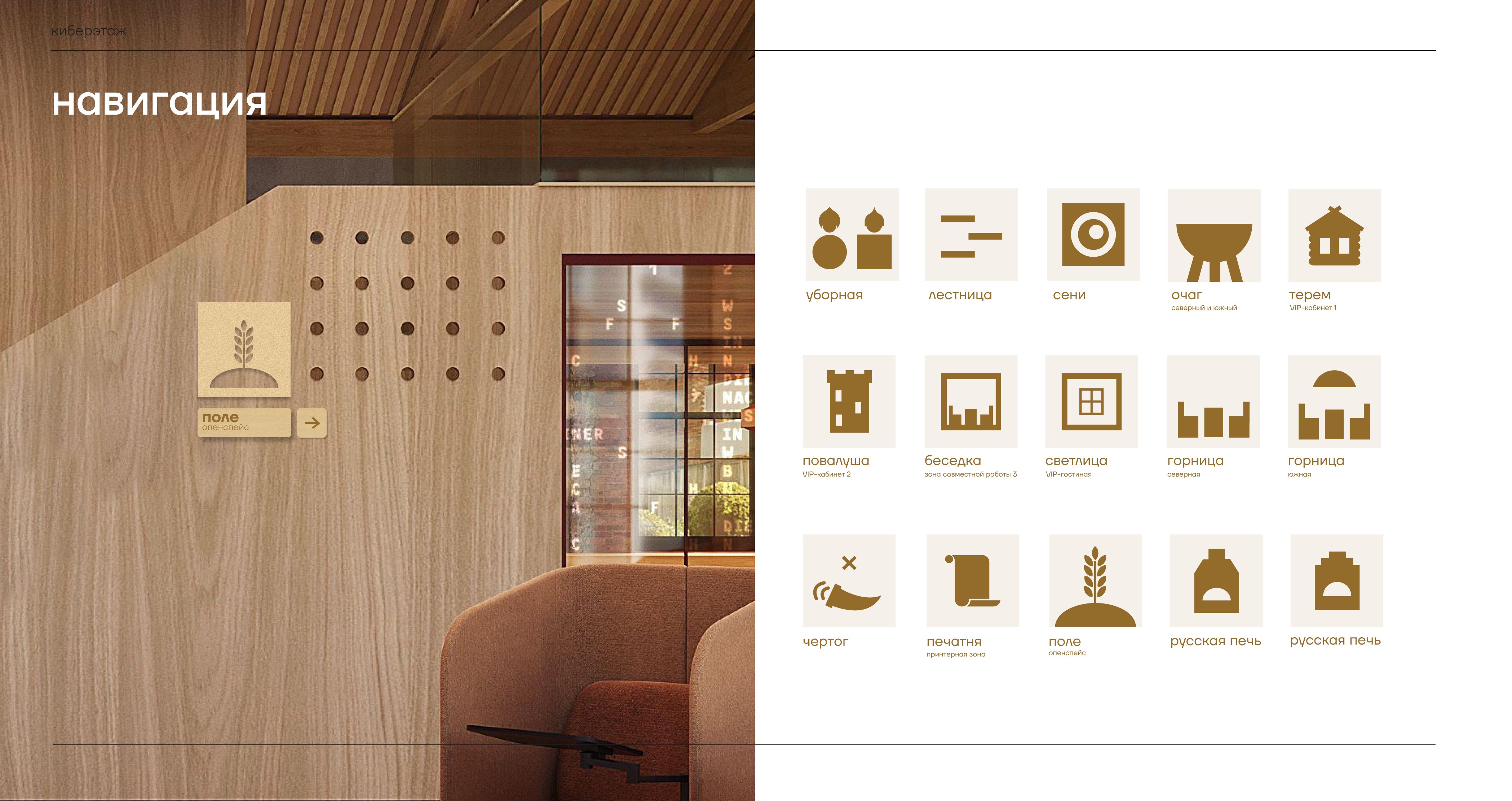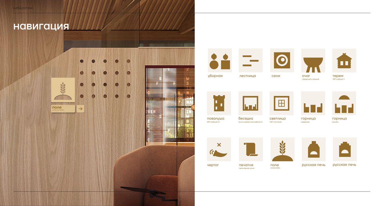 Навигация Киберэтажа становится продолжением смыслового языка. Названия пространств работают как ориентиры, указывая не просто на функции, а на результат: что почувствует гость, чего сможет достичь и как пространство будет работать на его цели. Русские печи как места силы, очаги как центры притяжения и источники коллаборативной энергии, терем и повалуша — древнерусские палаты, подчёркивающие приватность и статусность, и поле — живое адаптивное пространство, способное трансформироваться под любые задачи.