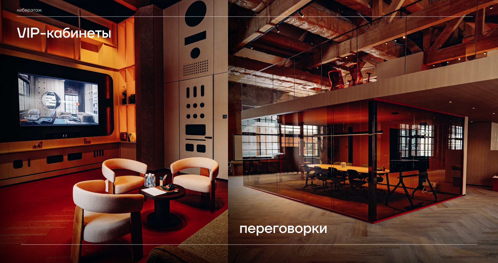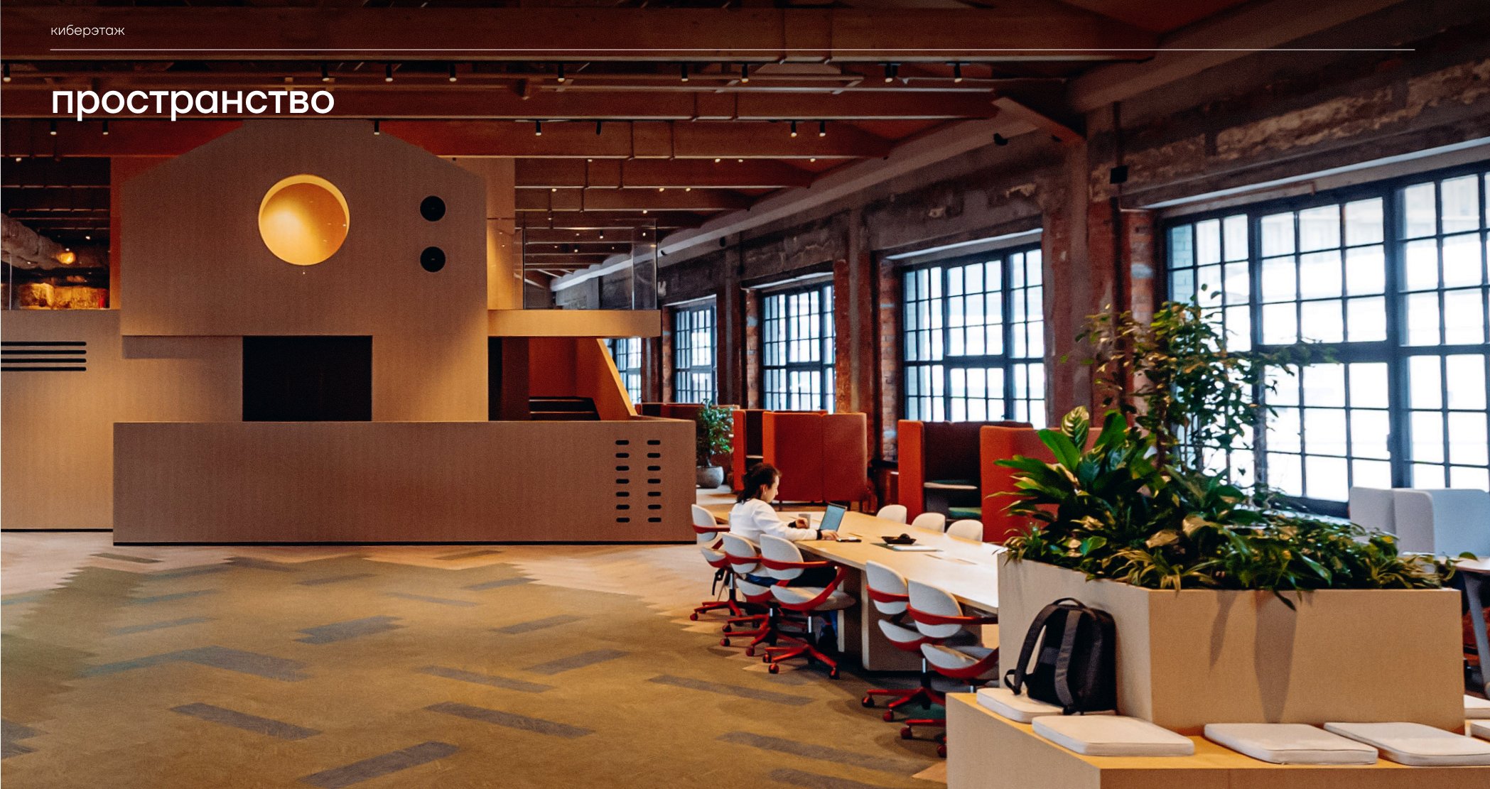 Киберэтаж — пространство клубного формата для лидеров технологической индустрии, основная цель которого — инициировать потоковое состояние для продуктивной работы и рождения прорывных идей, способных менять правила игры. Эти цели достигаются с помощью адаптивности пространства, где все его элементы многофункциональны и мобильны, что позволяет выходить за рамки и создавать нужную среду в моменте, и эффекта переключения — возможности ощущать связь с природой и корнями, оставаясь в центре мегаполиса.