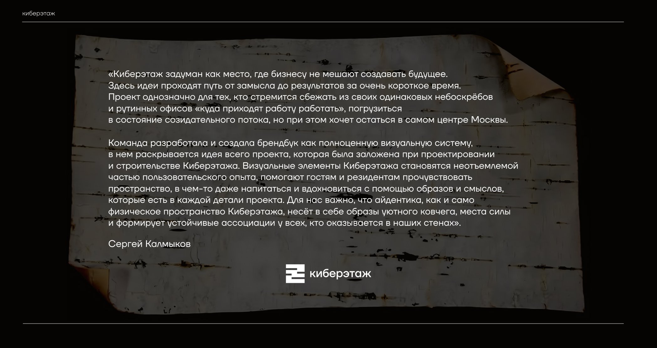 Сайт и презентации Киберэтажа — это визуально-вербальный конструктор, где архитектура информации работает на главную задачу — погрузить клиента в продукт и передать его ценность. Тексты начинаются с сути и постепенно погружают в детали. Метафоры работают как маркеры идентичности, но всегда подкрепляются конкретикой.