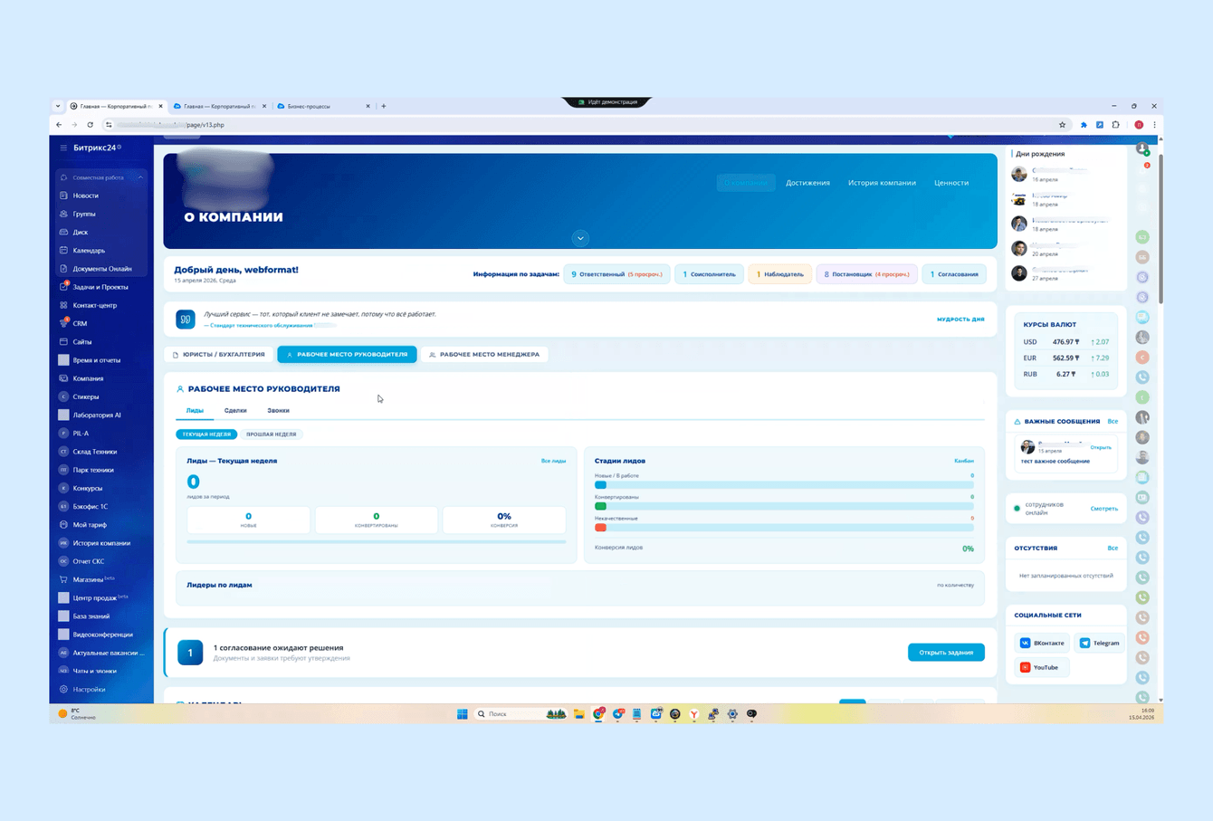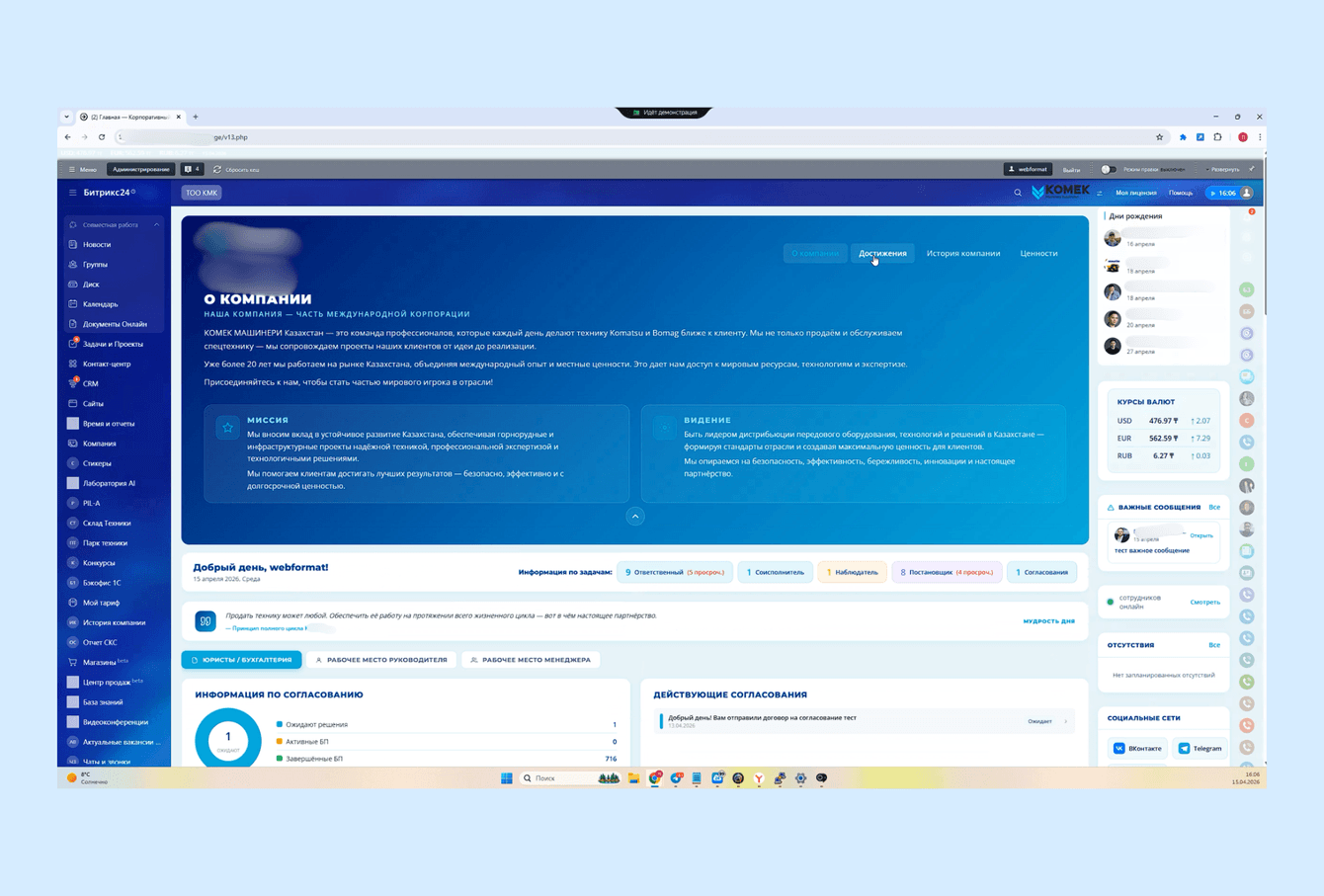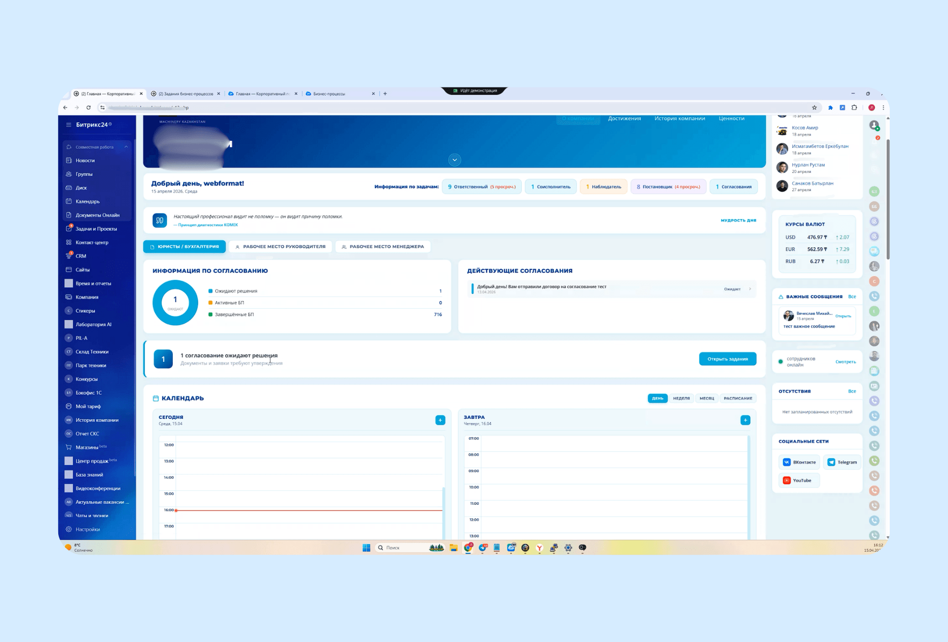 Мы собрали для клиента дашборд в коробке Битрикс24, который стал точкой входа в ежедневную работу. На главном экране сотрудник сразу видит ключевые блоки: важные сообщения, информацию по задачам, действующие согласования, календарь, курсы валют, быстрые переходы в профильные разделы и отдельные рабочие зоны для разных ролей. За счет этого портал перестал быть просто внутренним сайтом.