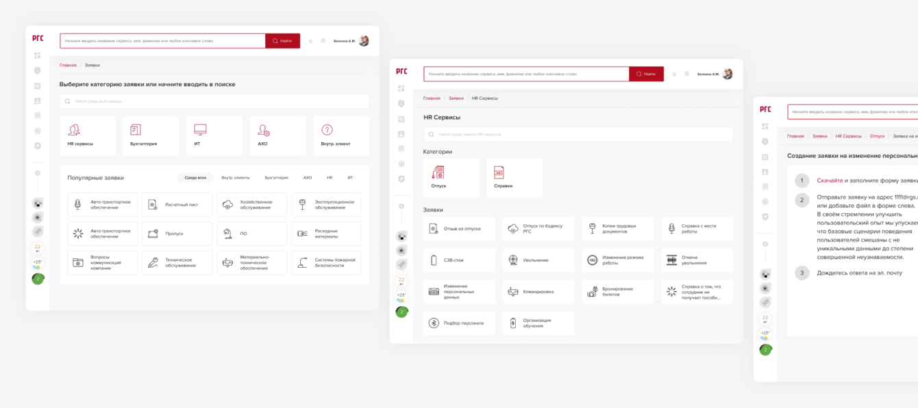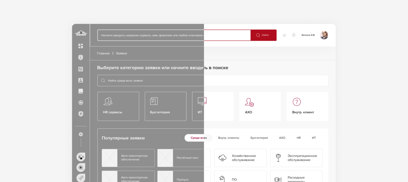 В разделе интранета размещён каталог услуг с удобной навигацией и поиском. Пользователь переходит в нужную систему напрямую, без повторной авторизации. Блок заявок включает 5 основных категорий и ссылки на популярные сервисы. Внутри — подкатегории или конкретные формы, которые адаптированы под каждый тип заявки. Раздел можно персонализировать: сотрудники сами выбирают, какие заявки выводить на главный экран.