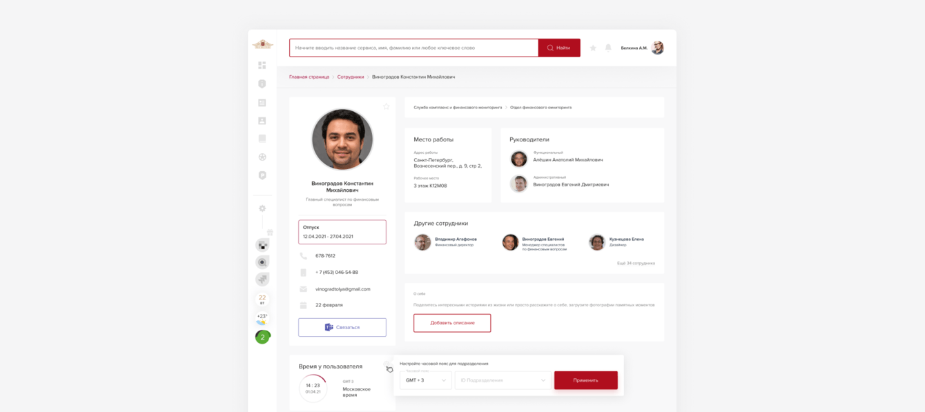 Профиль сотрудника формируется автоматически и дополняется вручную. Основная информация — департамент, филиал, рабочее место и руководитель — подтягивается из кадровой системы. Блок «О себе» заполняется самостоятельно: сотрудник может указать навыки и хобби, чтобы находить единомышленников и участвовать в клубах по интересам. Визуально профиль меняется в зависимости от наличия помощника, секретаря и заполненности персональных данных.