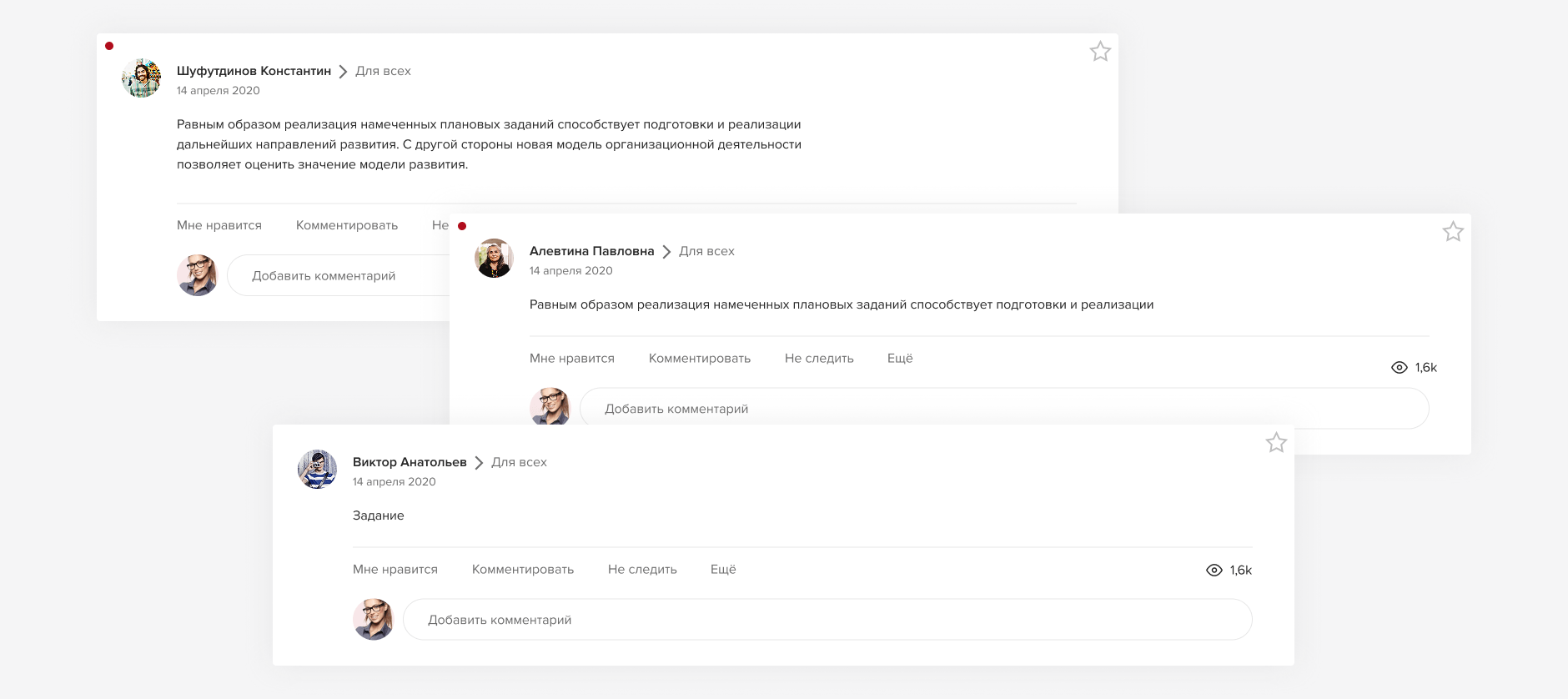 В Живой ленте на стартовой странице транслируются последние записи, опросы и публикации пользователей. Возможна публикация «для всех сотрудников» либо для определенного департамента, региона, рабочей группы и конкретного списка людей.