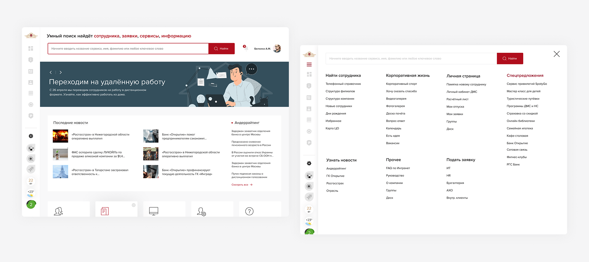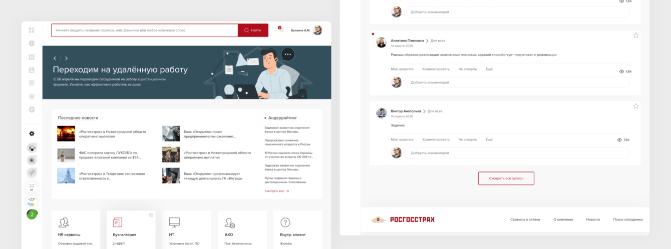 Перед стартом проекта «Росгосстрах» провёл внутреннее обследование и проблемные интервью с сотрудниками и руководителями. Чаще всего звучали запросы на быстрый поиск коллег, документов и новостей, а также на удобный доступ к сервисам, заявкам и создание рабочих групп.