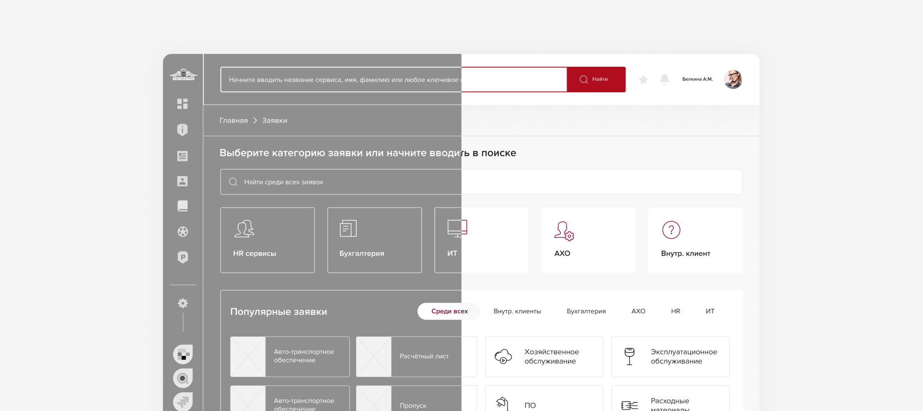 В разделе интранета размещён каталог услуг с удобной навигацией и поиском. Пользователь переходит в нужную систему напрямую, без повторной авторизации. Блок заявок включает 5 основных категорий и ссылки на популярные сервисы. Внутри — подкатегории или конкретные формы, которые адаптированы под каждый тип заявки. Раздел можно персонализировать: сотрудники сами выбирают, какие заявки выводить на главный экран.