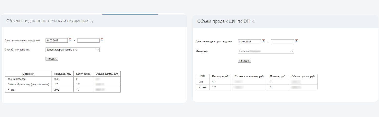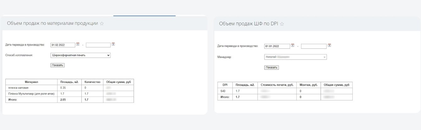 Для этой компании мы разработали различные отчеты объема продаж по производству, по работе отдела дизайна, по заказам менеджеров, по дебиторской задолженности. Теперь руководитель сможет анализировать объем продаж по менеджерам, средний чек дизайнера, объемы продаж по производству в разрезе способов изготовления, менеджеров, периоду по переводу в производство и др. отчеты.