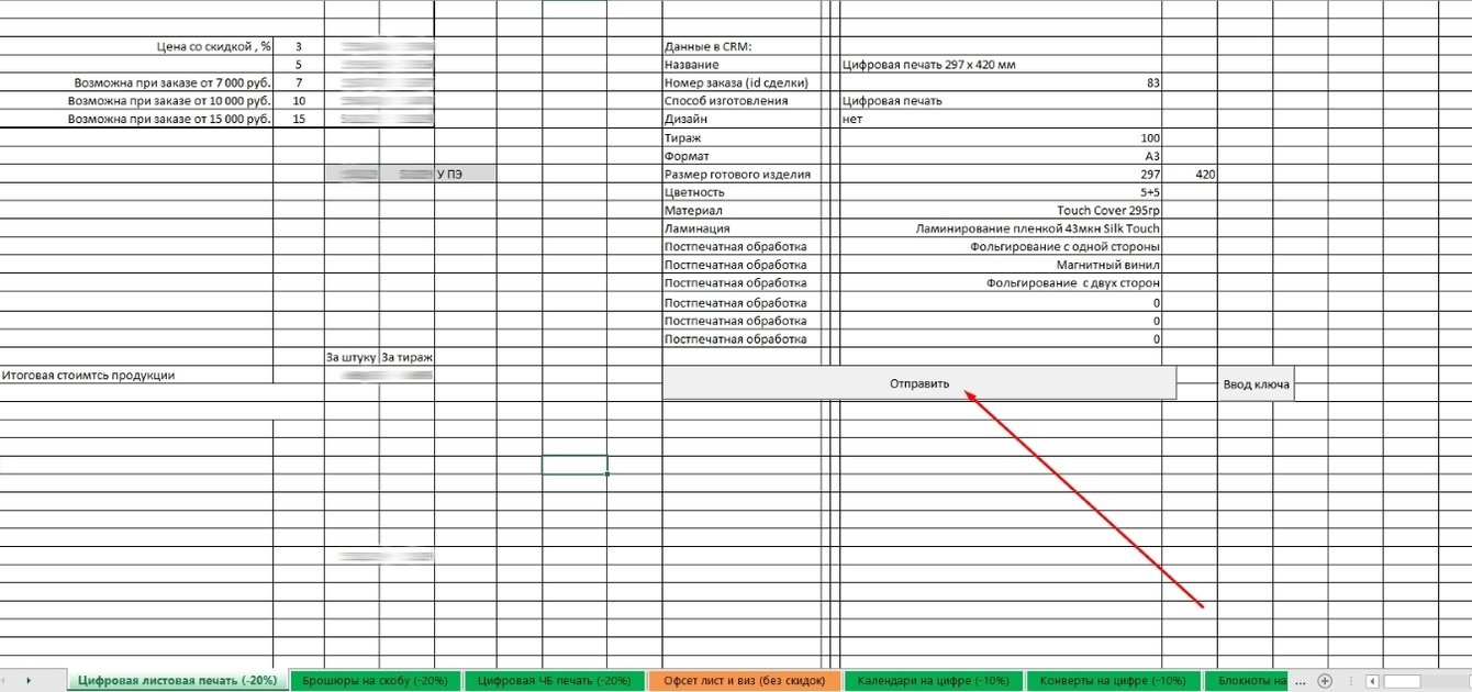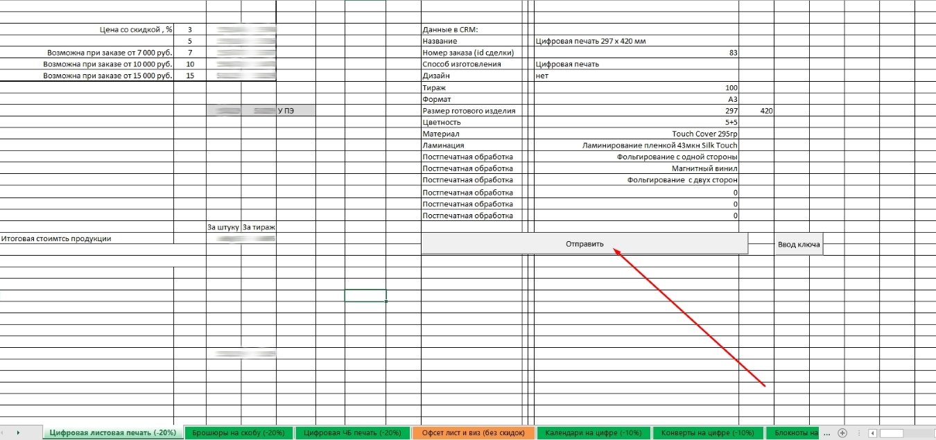 Мы автоматизировали процесс переноса данных по расчету — менеджеры, как и раньше, выполняют расчеты в уже имеющихся калькуляторах Excel и Google-таблицах, но теперь, лишь нажатием одной кнопки, все данные расчета попадают в нужную карточку заказа и производства.