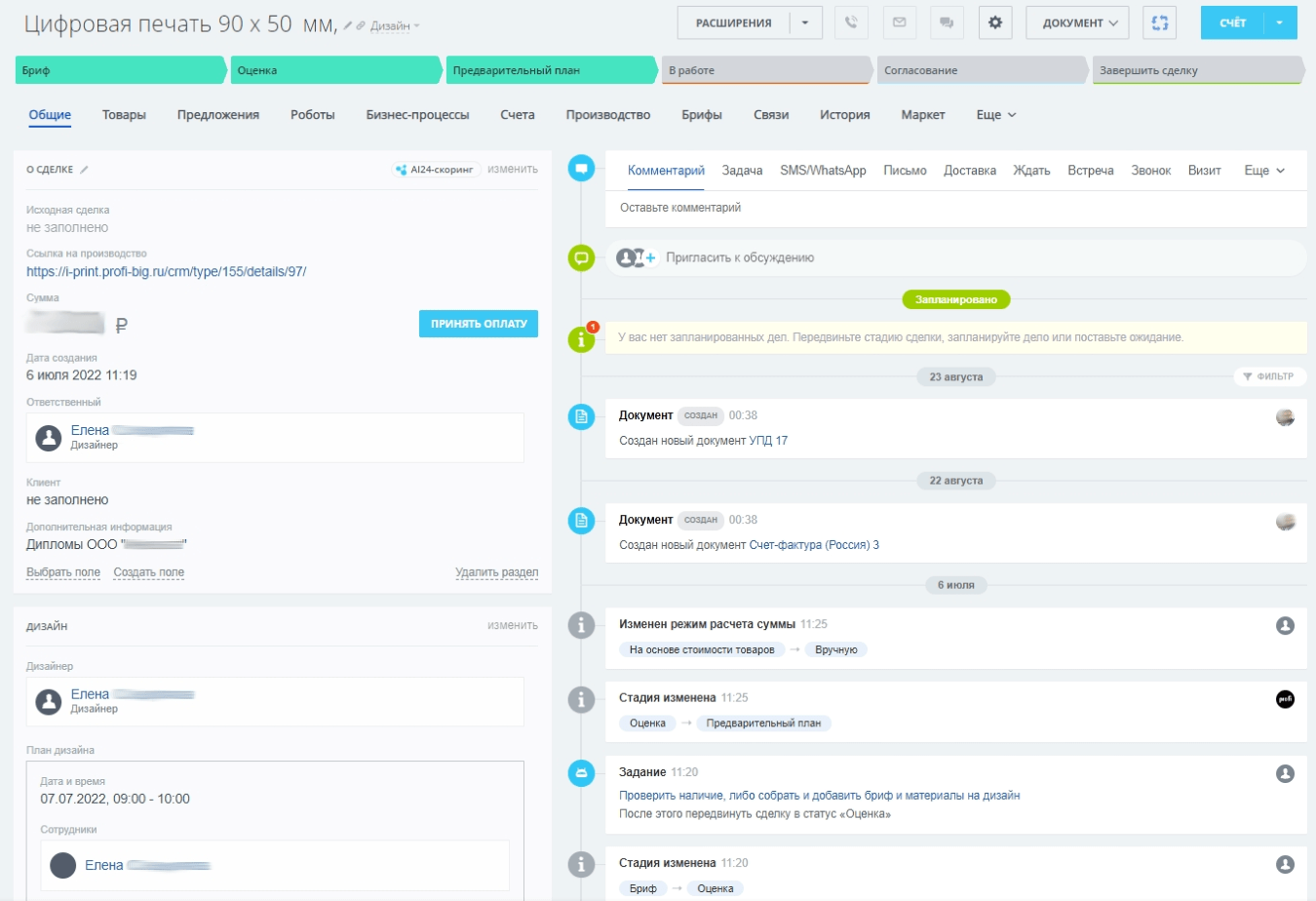 Настроили воронку от оценки работ по данным брифа/от допечатной обработки до согласования итоговых макетов с клиентом;