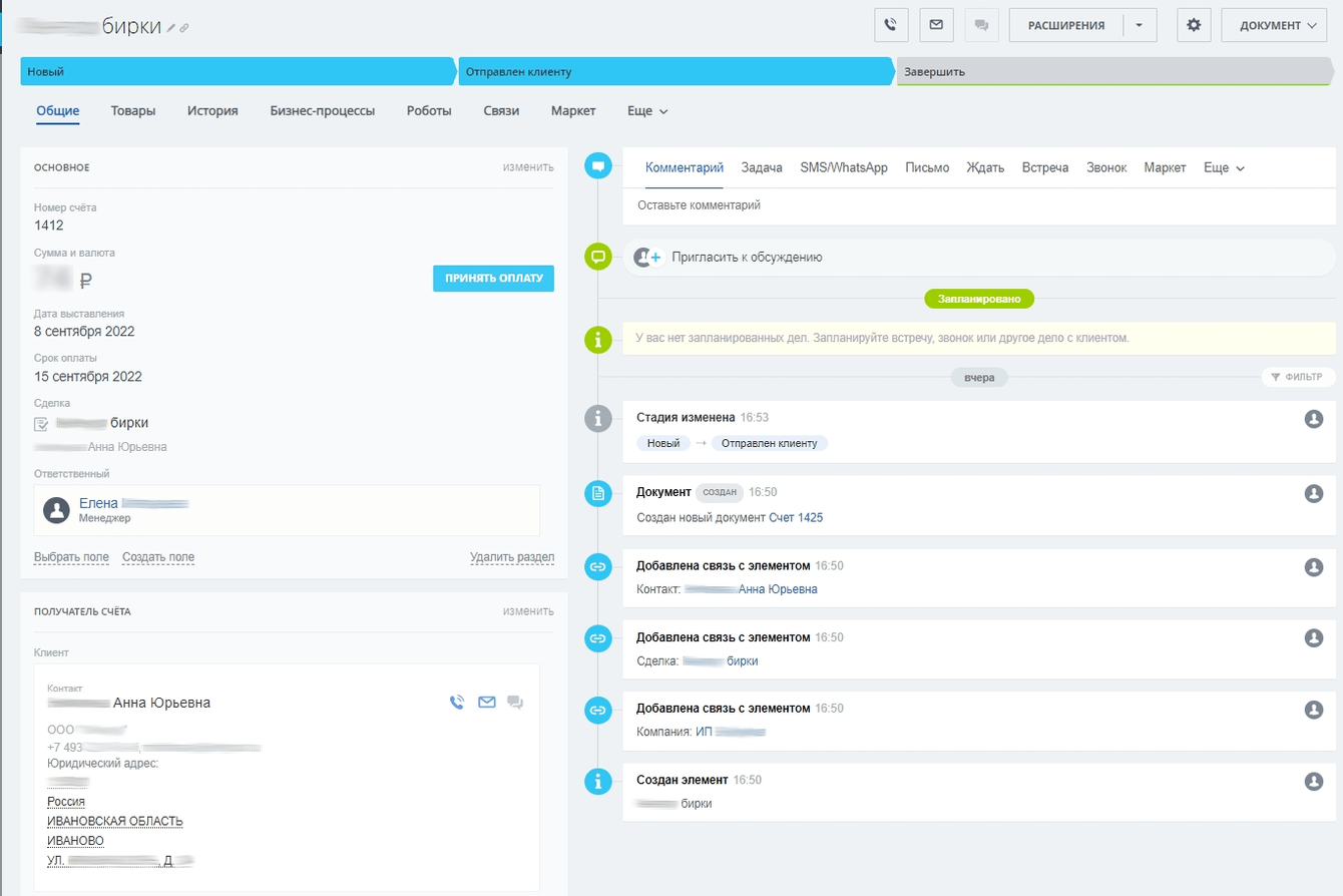 Бухгалтер больше не выставляет счета — ему остается проставить в карточке счета статус «Оплачен», а ответственный менеджер получит автоматическое уведомление.